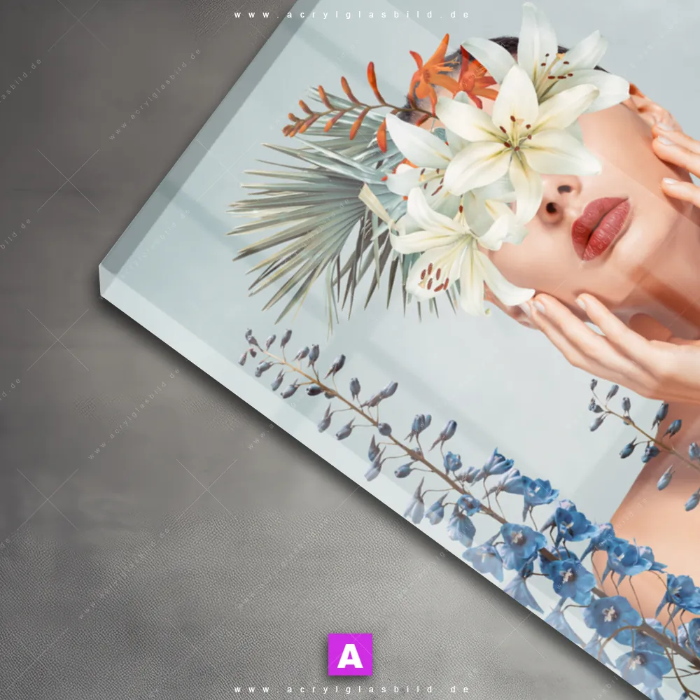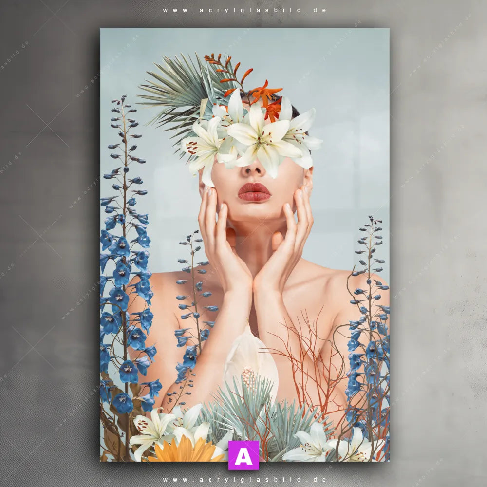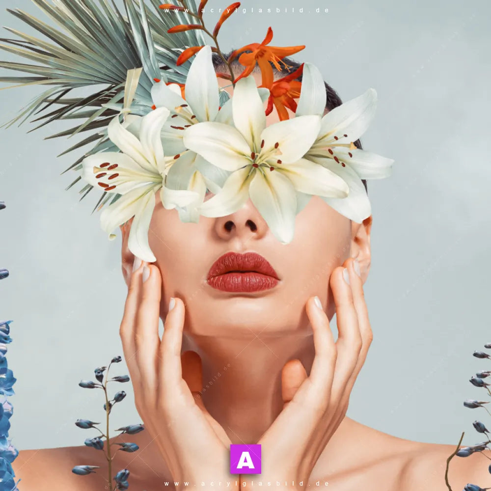<b>Produktart:</b> Acrylglasbild | Glasbild | Wandbild aus Kunstglas | <b> Motiv:</b> Frauenportrait mit Blumen | <b> Bildausrichtung:</b> Hochformat | <b> Max. Motiv-Größe:</b> 400cm breit | 315cm hoch | <b> Verfügbare Formate: </b> Quadrat, Querformat, Hochformat, Panorama, Schmal, Rund | <b> Kategorie:</b> Porträts - Menschen, Blumen - Botanik | <b> Farben:</b> Mint, Beige, Weiss, Blau, Orange | <b> Kunstformen:</b> Fotografie | <b> Kunststile:</b> Modern Art, Floral