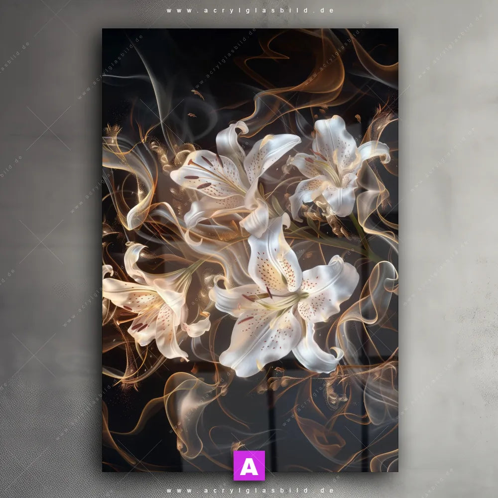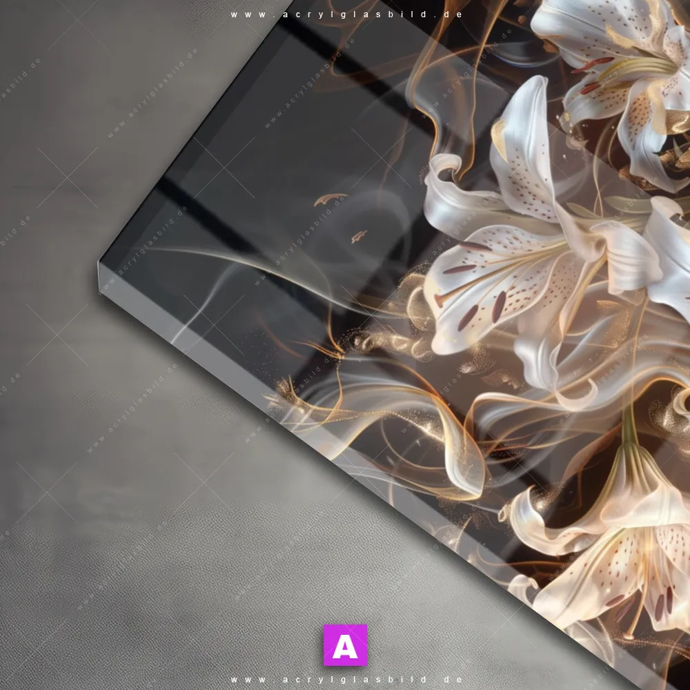 <b>Produktart:</b> Acrylglasbild | Glasbild | Wandbild aus Kunstglas | <b> Motiv:</b> Lilien in goldenem Rauch | <b> Bildausrichtung:</b> Hochformat | <b> Max. Motiv-Größe:</b> 200cm breit | 300cm hoch | <b> Verfügbare Formate: </b> Quadrat, Querformat, Hochformat, Panorama, Schmal, Rund | <b> Kategorie:</b> Blumen - Botanik | <b> Farben:</b> Weiss, Schwarz, Gold | <b> Kunstformen:</b> Digitale Kunst | <b> Kunststile:</b> Floral, Modern Art