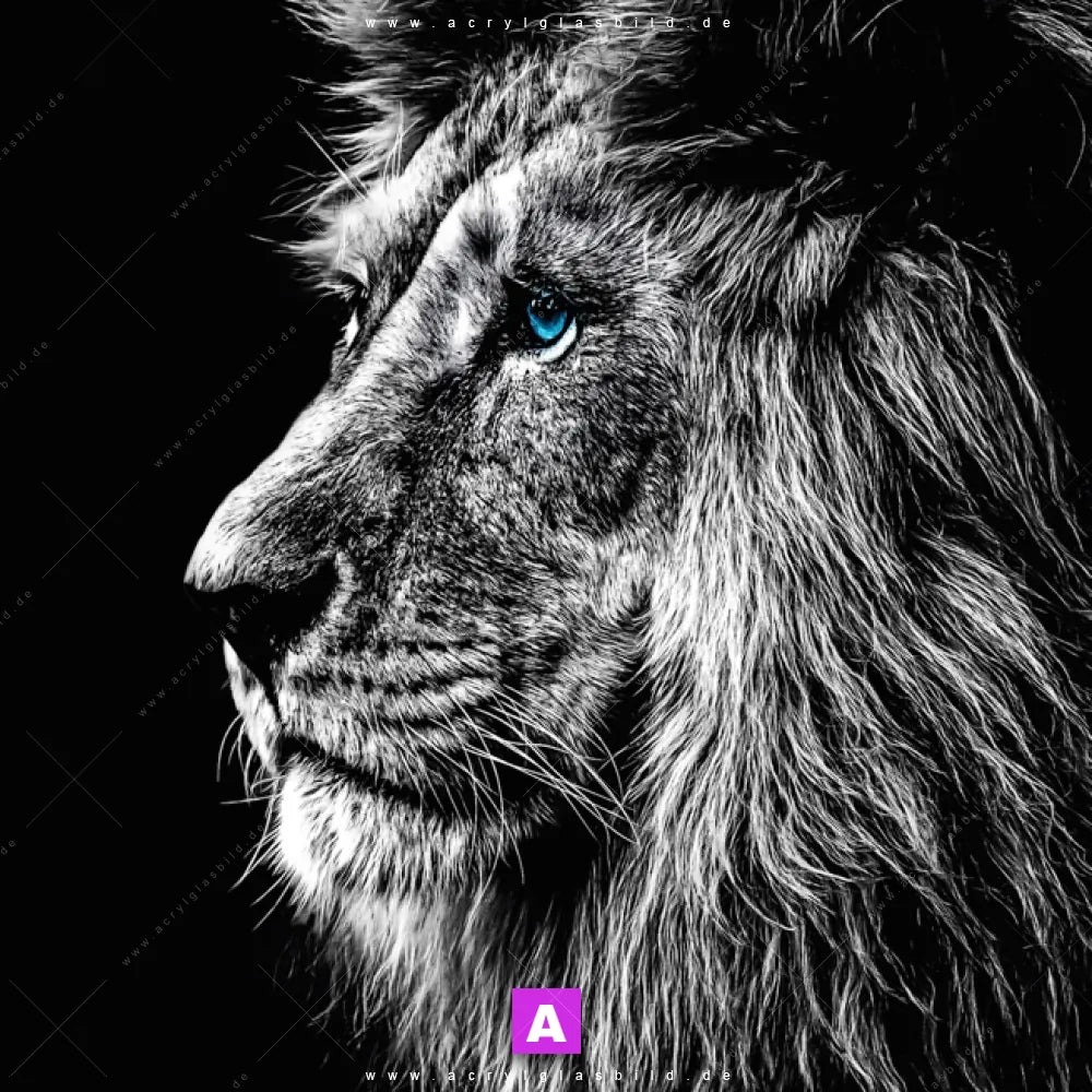 <b>Produktart:</b> Acrylglasbild | Glasbild | Wandbild aus Kunstglas | <b> Motiv:</b> Löwe mit blauen Augen | <b> Bildausrichtung:</b> Hochformat | <b> Max. Motiv-Größe:</b> 305cm breit | 200cm hoch | <b> Verfügbare Formate: </b> Quadrat, Querformat, Hochformat, Panorama, Schmal, Rund | <b> Kategorie:</b> Tierwelt | <b> Farben:</b> Weiss, Schwarz | <b> Kunstformen:</b> Fotografie | <b> Kunststile:</b> Natürlich - Realistisch, Schwarz - Weiss