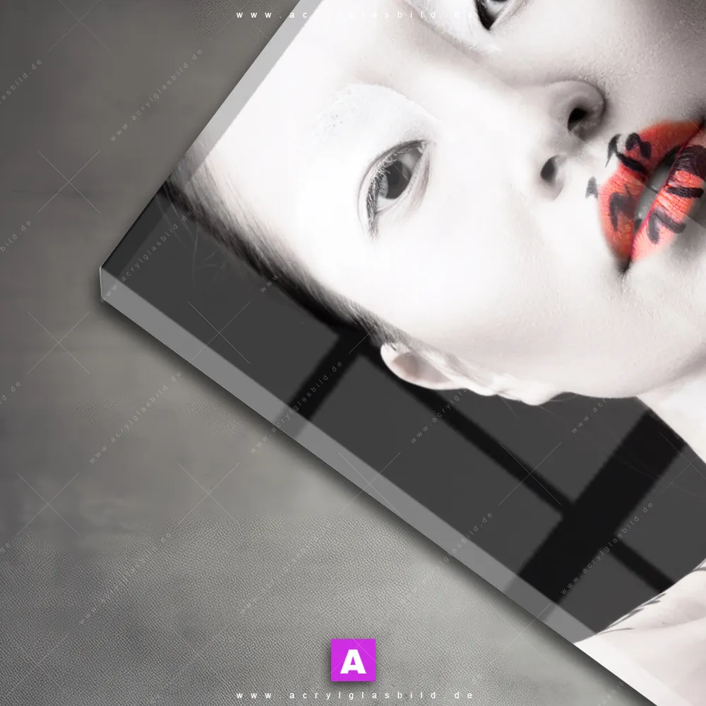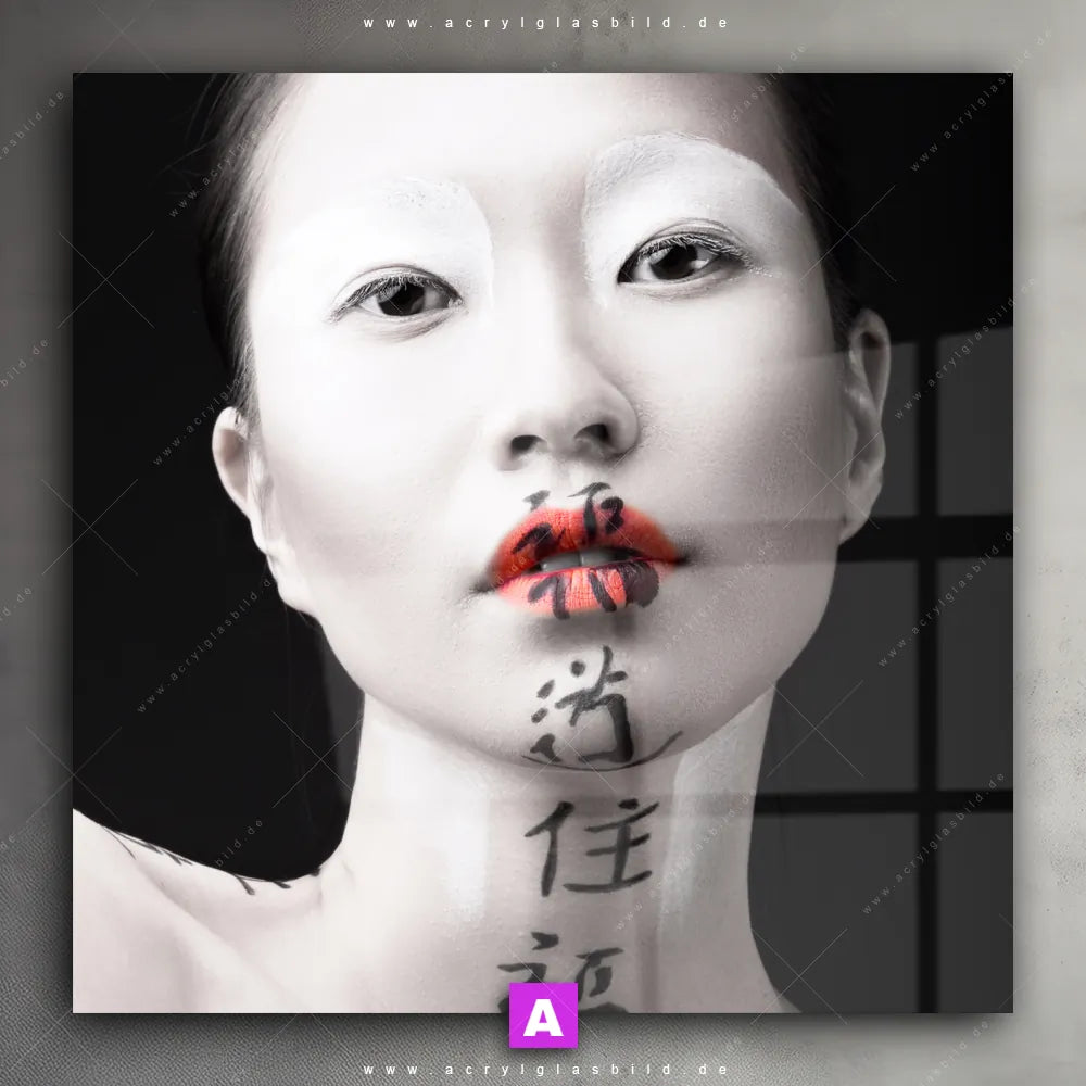 Das Motiv Asiatische Schönheit wird im UV-Direktdruck in den Farben Schwarz, Weiss, Rot auf die Rückseite einer 5mm starken, transparenten Acrylglasplatte gedruckt. Das durchscheinende Motiv Asiatische Frau mit Schriftzeichen im Schwarz - Weiss, Minimalistisch Stil wird anschließend vollflächig mit einer weißen Schicht hinterlegt. Das Porträts - Menschen Acrylglasbild | Quadrat erhält so eine bemerkenswerte Farbbrillanz, hohe Schärfe und erstaunliche Tiefenwirkung.