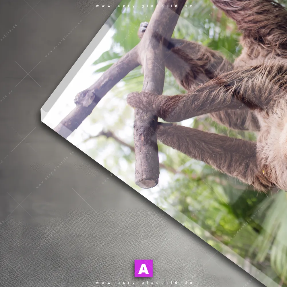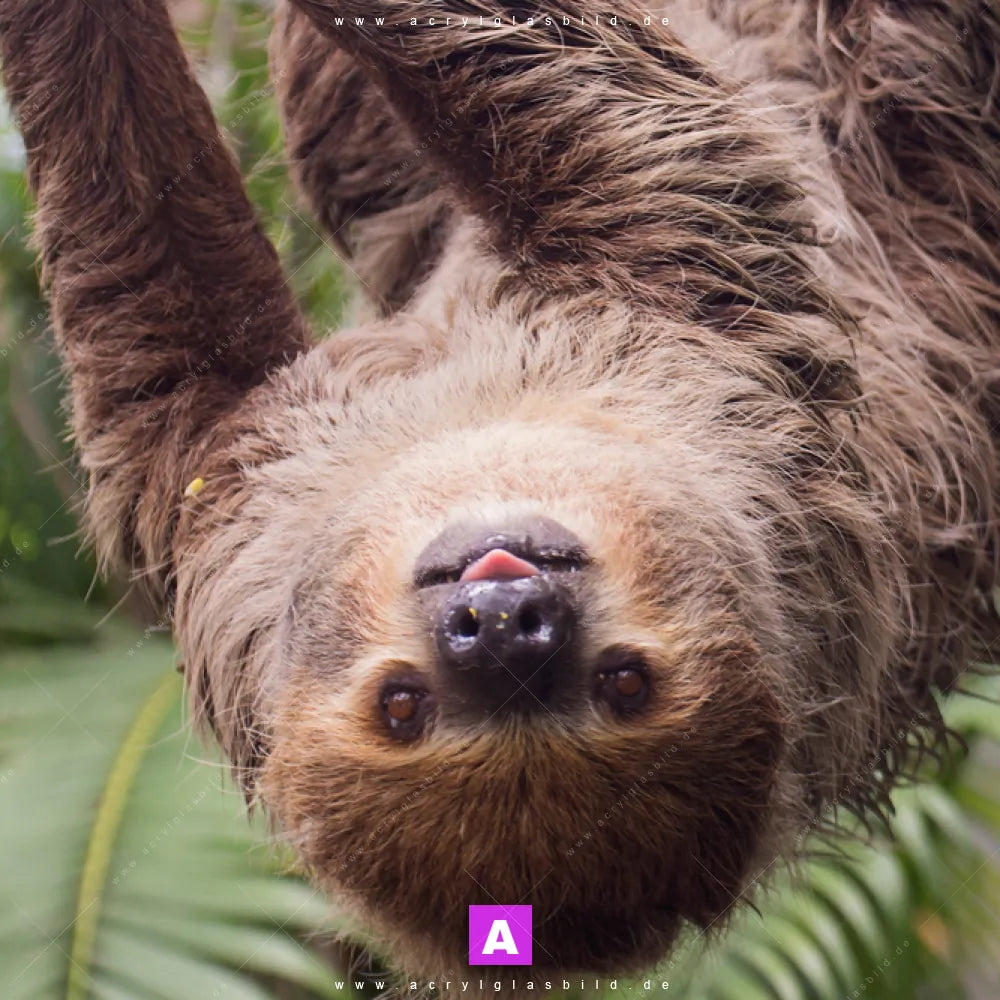 Das Motiv Faultier streckt Zunge raus wird im UV-Direktdruck in den Farben Braun, Grün auf die Rückseite einer 5mm starken, transparenten Acrylglasplatte gedruckt. Das durchscheinende Motiv Faultier zeigt Zunge im Natürlich - Realistisch Stil wird anschließend vollflächig mit einer weißen Schicht hinterlegt. Das Tierwelt, Wald - Bäume Acrylglasbild | Quadrat erhält so eine bemerkenswerte Farbbrillanz, hohe Schärfe und erstaunliche Tiefenwirkung.