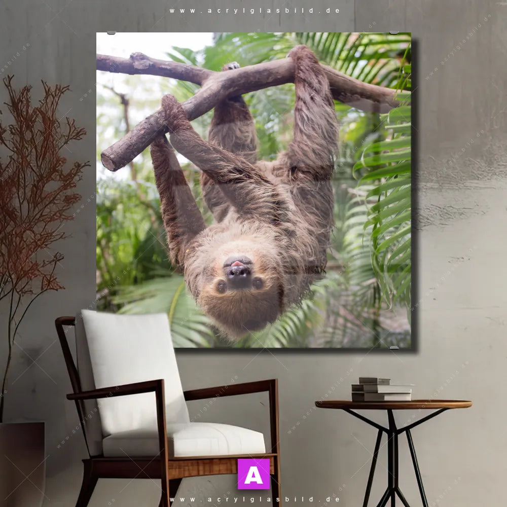 <b>Produktart:</b> Acrylglasbild | Glasbild | Wandbild aus Kunstglas | <b> Motiv:</b> Faultier streckt Zunge raus | <b> Bildausrichtung:</b> Quadrat | <b> Max. Motiv-Größe:</b> 450cm breit | 300cm hoch | <b> Verfügbare Formate: </b> Quadrat, Querformat, Hochformat, Panorama, Schmal, Rund | <b> Kategorie:</b> Tierwelt, Wald - Bäume | <b> Farben:</b> Braun, Grün | <b> Kunstformen:</b> Fotografie | <b> Kunststile:</b> Natürlich - Realistisch