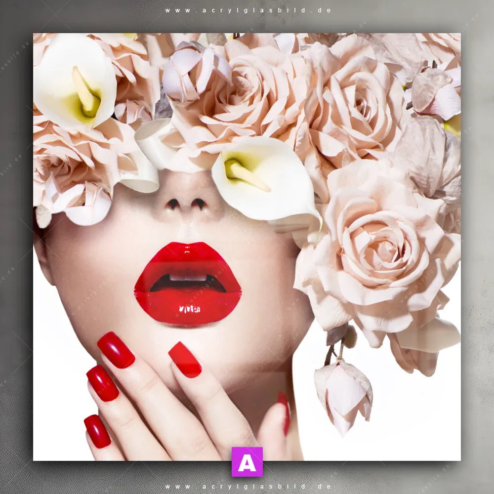 <b>Produktart:</b> Acrylglasbild | Glasbild | Wandbild aus Kunstglas | <b> Motiv:</b> Gesicht & Rosen | <b> Bildausrichtung:</b> Quadrat | <b> Max. Motiv-Größe:</b> 400cm breit | 300cm hoch | <b> Verfügbare Formate: </b> Quadrat, Querformat, Hochformat, Panorama, Schmal, Rund | <b> Kategorie:</b> Porträts - Menschen, Blumen - Botanik | <b> Farben:</b> Beige, Weiss, Rot | <b> Kunstformen:</b> Fotografie | <b> Kunststile:</b> Modern Art, Floral