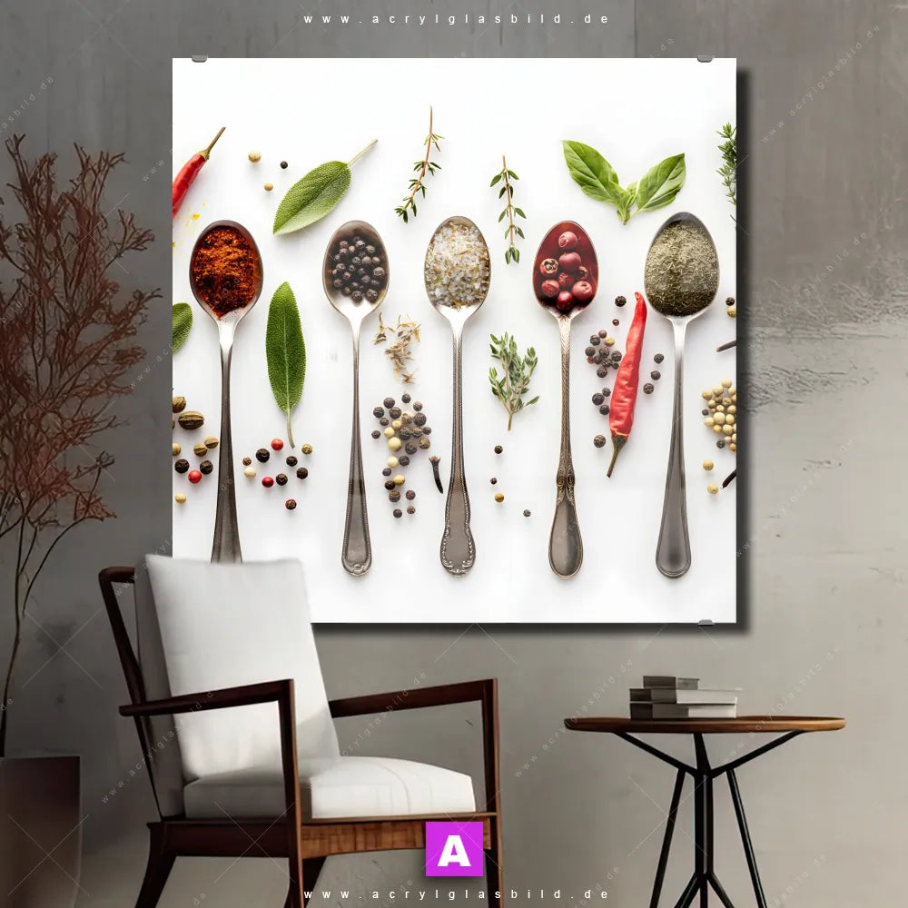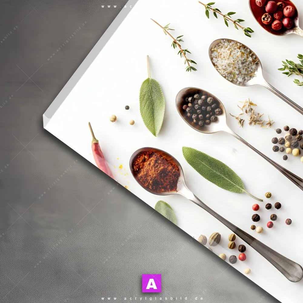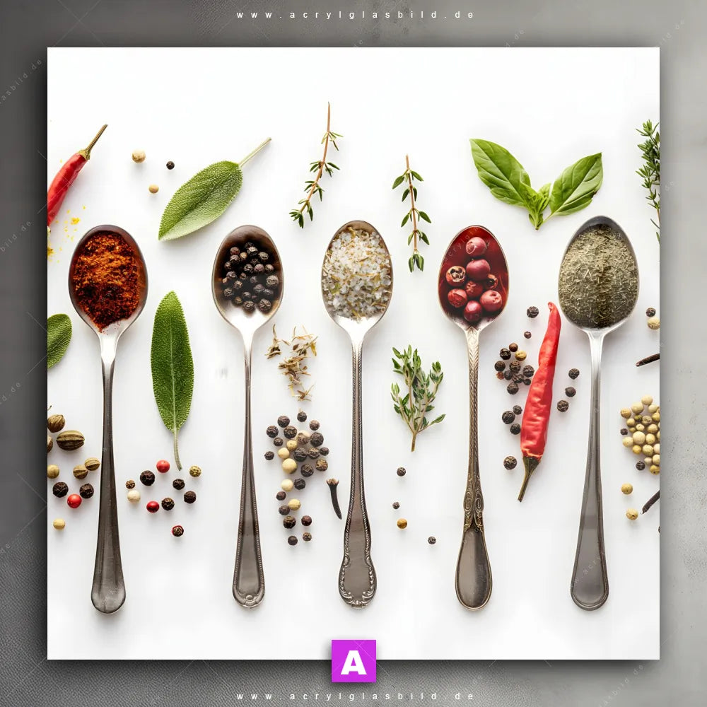 <b>Produktart:</b> Acrylglasbild | Glasbild | Wandbild aus Kunstglas | <b> Motiv:</b> Gewürzvielfalt | <b> Bildausrichtung:</b> Quadrat | <b> Max. Motiv-Größe:</b> 450cm breit | 300cm hoch | <b> Verfügbare Formate: </b> Quadrat, Querformat, Hochformat, Panorama, Schmal, Rund | <b> Kategorie:</b> Essen - Trinken | <b> Farben:</b> Weiss, Silber, Grün | <b> Kunstformen:</b> Digitale Kunst, Fotografie | <b> Kunststile:</b> Natürlich - Realistisch