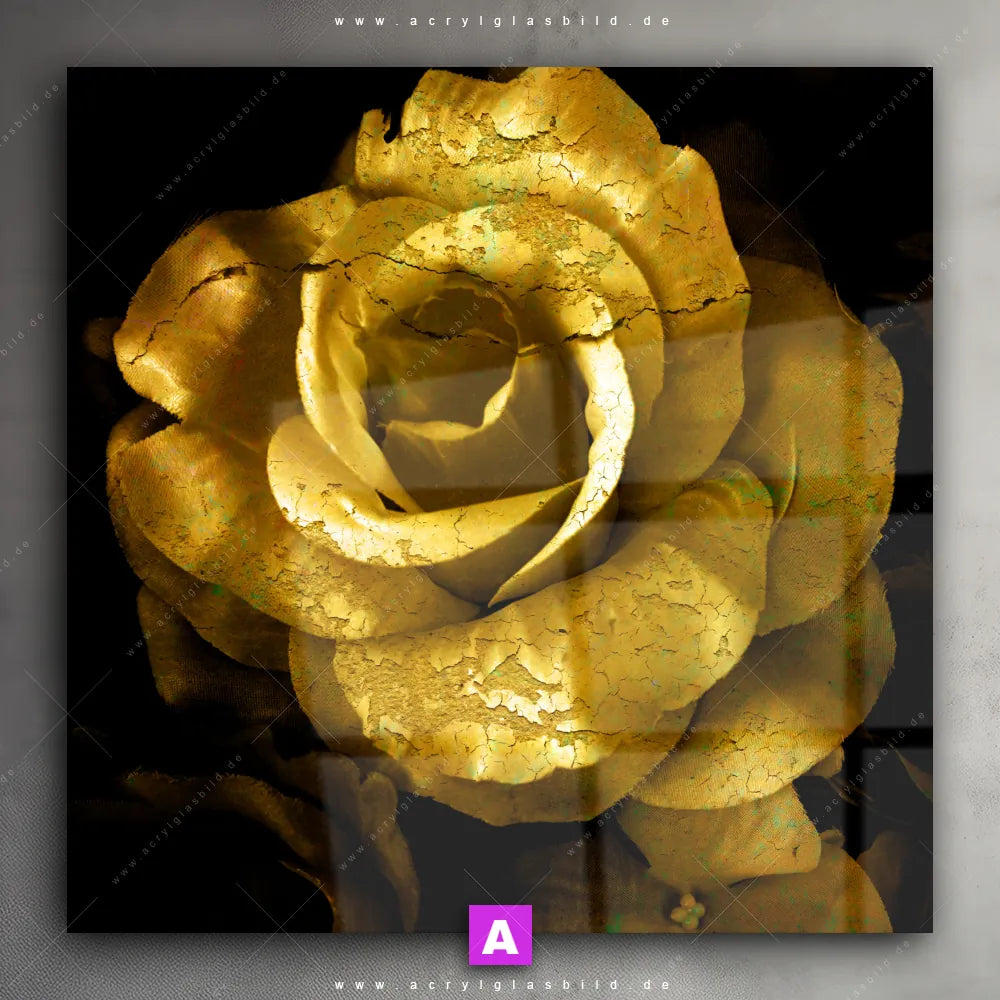 <b>Produktart:</b> Acrylglasbild | Glasbild | Wandbild aus Kunstglas | <b> Motiv:</b> Goldene Rose | <b> Bildausrichtung:</b> Quadrat | <b> Max. Motiv-Größe:</b> 180cm breit | 180cm hoch | <b> Verfügbare Formate: </b> Quadrat, Querformat, Hochformat, Panorama, Schmal, Rund | <b> Kategorie:</b> Blumen - Botanik | <b> Farben:</b> Gold, Schwarz | <b> Kunstformen:</b> Digitale Kunst | <b> Kunststile:</b> Minimalistisch