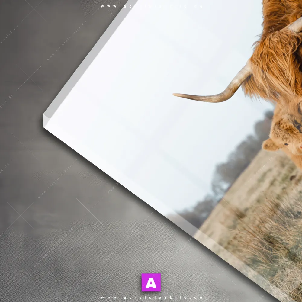 Das Motiv Highlander Familie wird im UV-Direktdruck in den Farben Braun, Beige, Weiss auf die Rückseite einer 5mm starken, transparenten Acrylglasplatte gedruckt. Das durchscheinende Motiv Hochlandrind mit Kalb im Modern Art, Natürlich - Realistisch Stil wird anschließend vollflächig mit einer weißen Schicht hinterlegt. Das Tierwelt Acrylglasbild | Quadrat erhält so eine bemerkenswerte Farbbrillanz, hohe Schärfe und erstaunliche Tiefenwirkung.