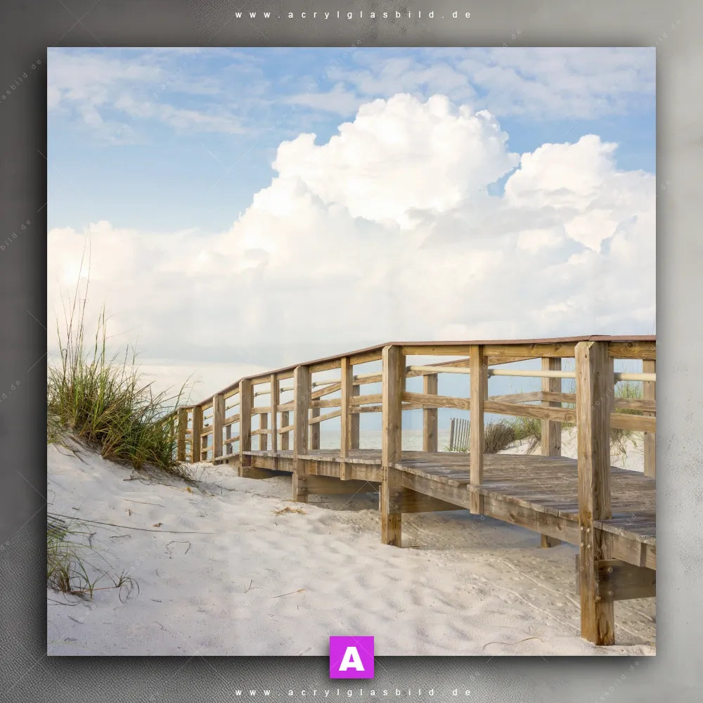Bist du es leid, ständig auf deine tristen Wände zu starren und dir vorzustellen, wie viel lebendiger sie sein könnten? Wir haben die ideale Lösung für dich: Unser Acrylglasbild Holzsteg & Dünen im Quadrat-Format haucht deinen Räumen sofort neues Leben ein!