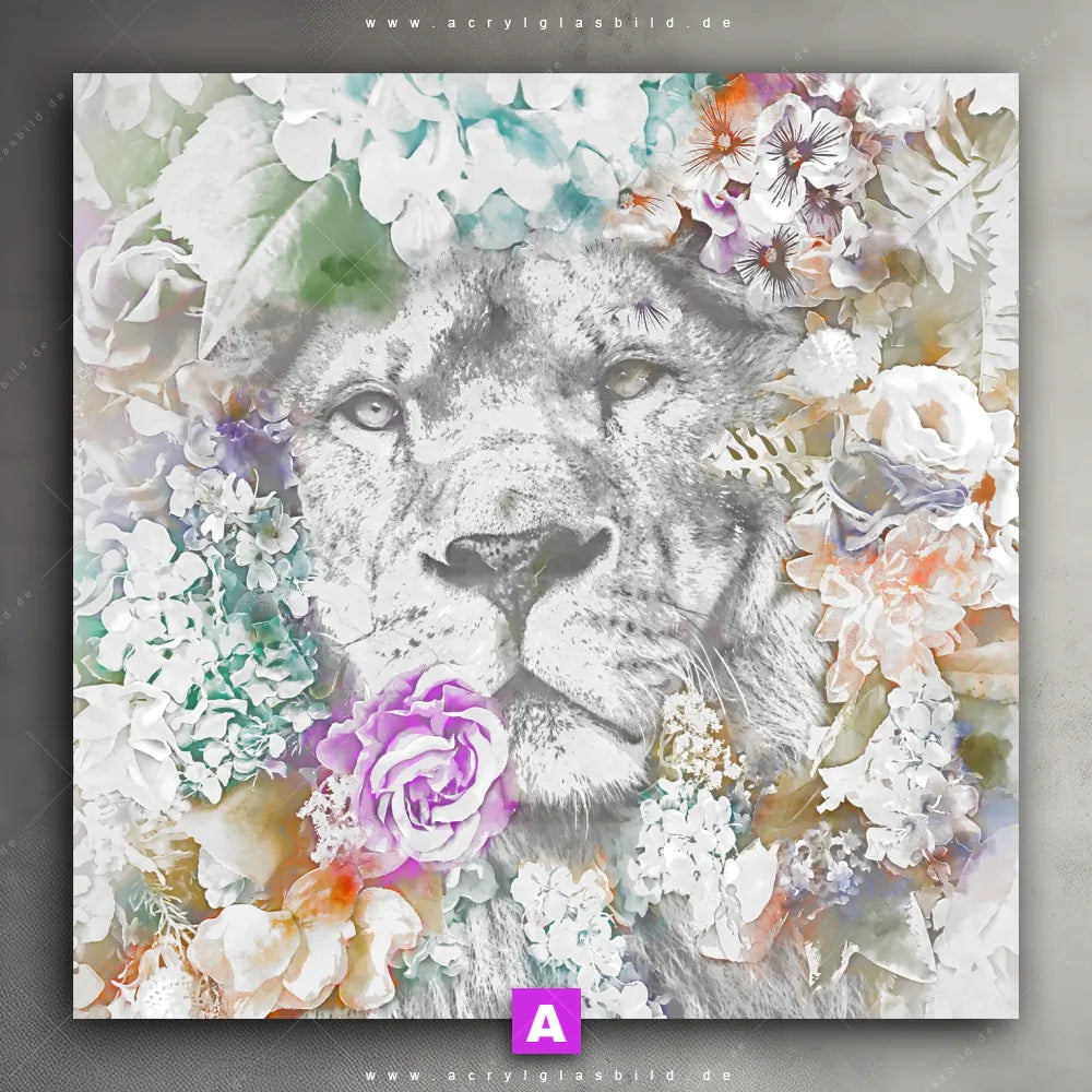 <b>Produktart:</b> Acrylglasbild | Glasbild | Wandbild aus Kunstglas | <b> Motiv:</b> Löwe & Blumen | <b> Bildausrichtung:</b> Quadrat | <b> Max. Motiv-Größe:</b> 240cm breit | 350cm hoch | <b> Verfügbare Formate: </b> Quadrat, Querformat, Hochformat, Panorama, Schmal, Rund | <b> Kategorie:</b> Tierwelt, Blumen - Botanik | <b> Farben:</b> Rosa, Pink, Weiss, Grau , Grün, Gold, Orange, Braun, Beige | <b> Kunstformen:</b> Kunst - Malerei | <b> Kunststile:</b> Floral, Modern Art