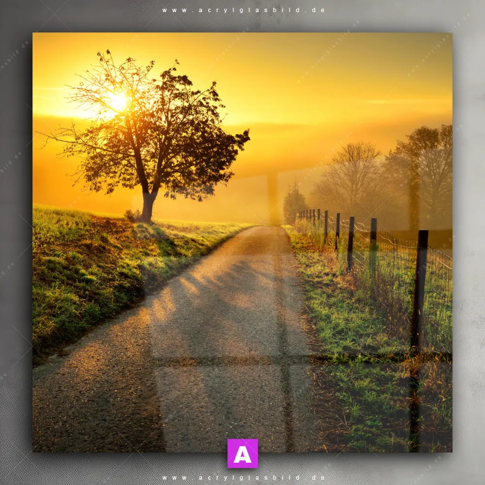 Das Motiv Morgenspaziergang wird im UV-Direktdruck in den Farben Orange auf die Rückseite einer 5mm starken, transparenten Acrylglasplatte gedruckt. Das durchscheinende Motiv Landschaft in der Morgensonne im Natürlich - Realistisch Stil wird anschließend vollflächig mit einer weißen Schicht hinterlegt. Das Landschaften Acrylglasbild | Quadrat erhält so eine bemerkenswerte Farbbrillanz, hohe Schärfe und erstaunliche Tiefenwirkung.