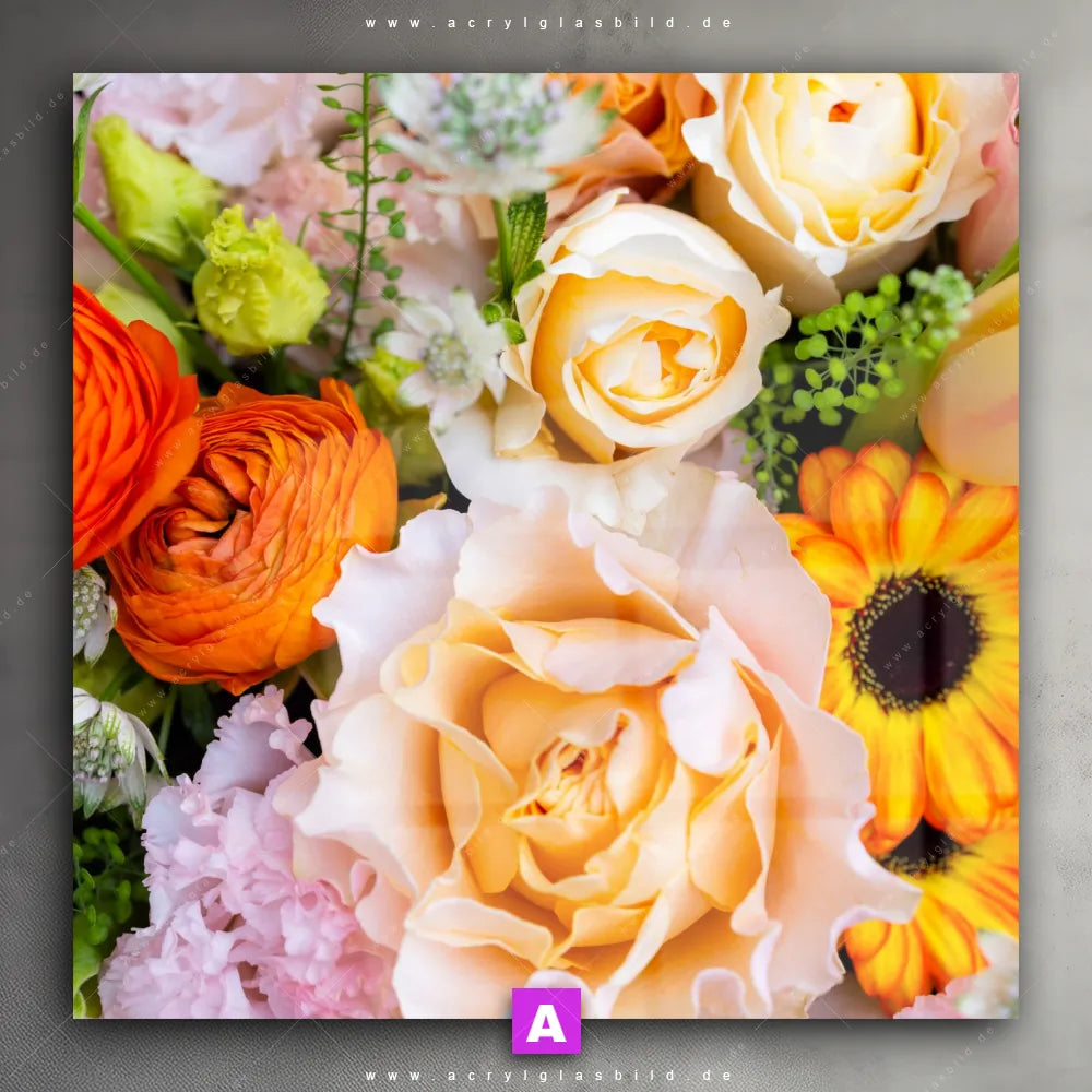 Das Motiv Sommerblumen wird im UV-Direktdruck in den Farben Grün, Orange, Rosa auf die Rückseite einer 5mm starken, transparenten Acrylglasplatte gedruckt. Das durchscheinende Motiv Floraler Blumengruß im Floral, Natürlich - Realistisch Stil wird anschließend vollflächig mit einer weißen Schicht hinterlegt. Das Blumen - Botanik Acrylglasbild | Quadrat erhält so eine bemerkenswerte Farbbrillanz, hohe Schärfe und erstaunliche Tiefenwirkung.