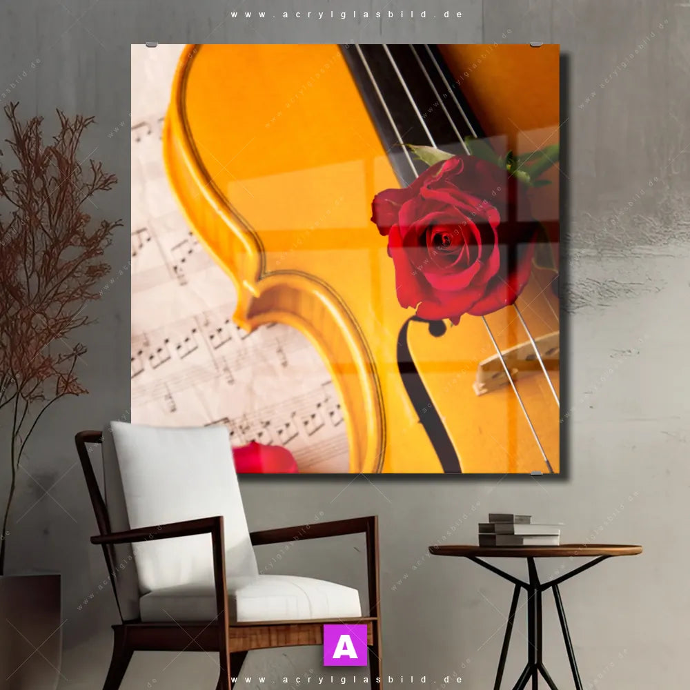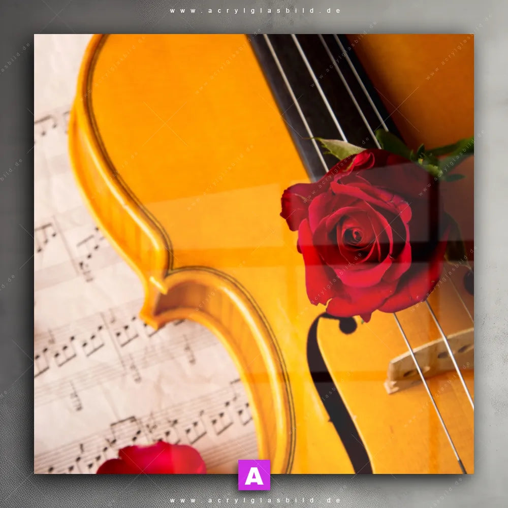 <b>Produktart:</b> Acrylglasbild | Glasbild | Wandbild aus Kunstglas | <b> Motiv:</b> Violine & Rose | <b> Bildausrichtung:</b> Quadrat | <b> Max. Motiv-Größe:</b> 270cm breit | 180cm hoch | <b> Verfügbare Formate: </b> Quadrat, Querformat, Hochformat, Panorama, Schmal, Rund | <b> Kategorie:</b> Blumen - Botanik | <b> Farben:</b> Rot, Beige, Braun | <b> Kunstformen:</b> Fotografie | <b> Kunststile:</b> Floral, Natürlich - Realistisch