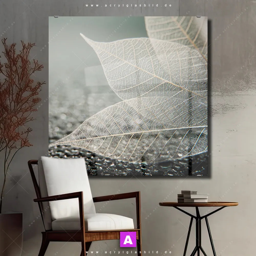 Das Motiv Weiße Blätter wird im UV-Direktdruck in den Farben Weiss, Schwarz, Grau auf die Rückseite einer 5mm starken, transparenten Acrylglasplatte gedruckt. Das durchscheinende Motiv Blätter mit Wassertropfen auf Stein im Modern Art, Floral Stil wird anschließend vollflächig mit einer weißen Schicht hinterlegt. Das Muster - Texturen, Blumen - Botanik Acrylglasbild | Quadrat erhält so eine bemerkenswerte Farbbrillanz, hohe Schärfe und erstaunliche Tiefenwirkung.