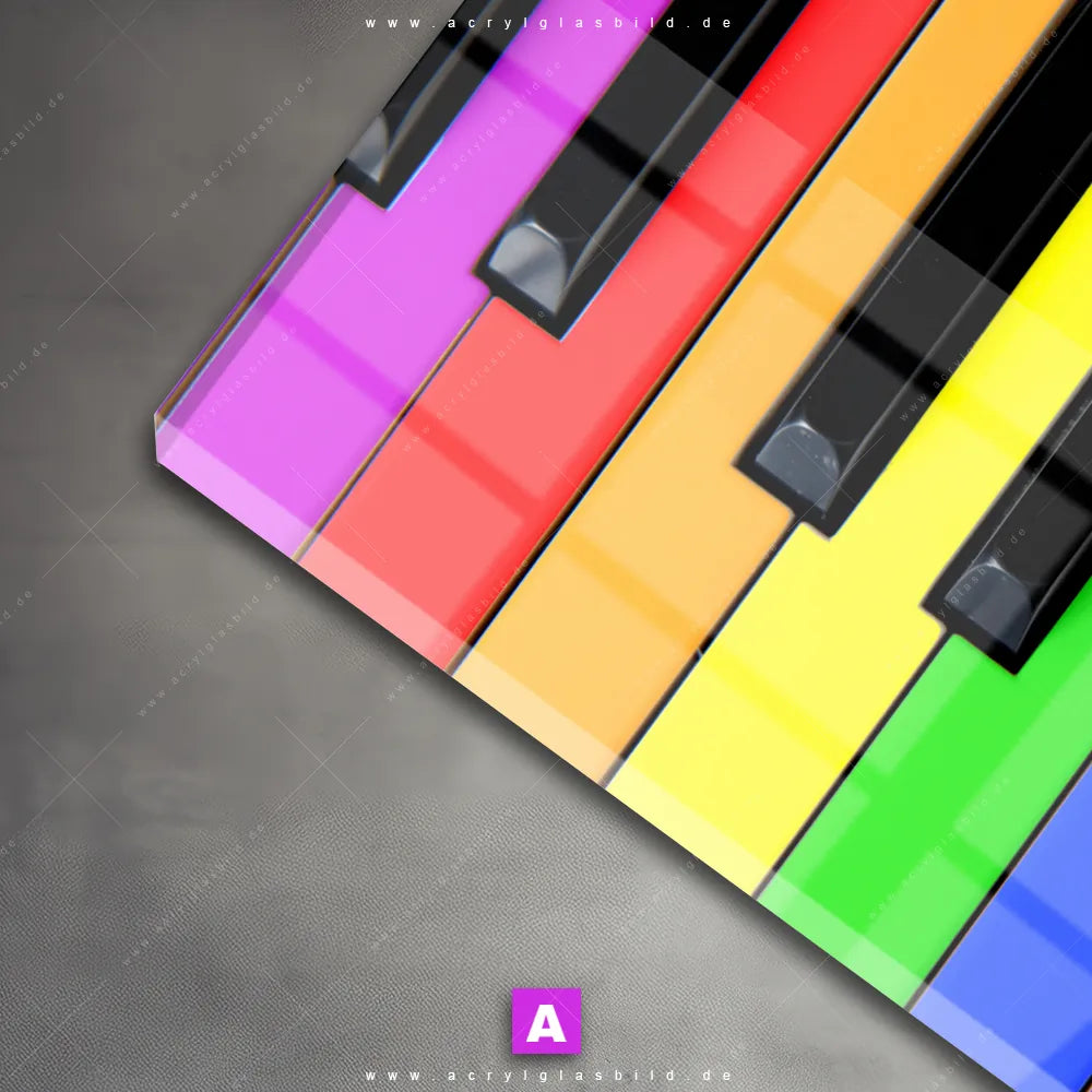 <b>Produktart:</b> Acrylglasbild | Glasbild | Wandbild aus Kunstglas | <b> Motiv:</b> Bunte Klaviertasten | <b> Bildausrichtung:</b> Querformat | <b> Max. Motiv-Größe:</b> 270cm breit | 180cm hoch | <b> Verfügbare Formate: </b> Quadrat, Querformat, Hochformat, Panorama, Schmal, Rund | <b> Kategorie:</b> Muster - Texturen | <b> Farben:</b> Bunt | <b> Kunstformen:</b> Fotografie | <b> Kunststile:</b> Modern Art