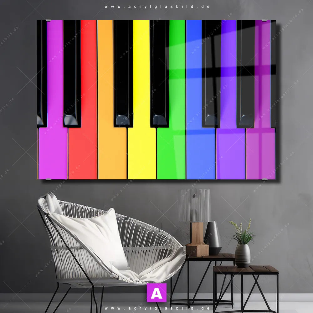 Hallo, du Meister der Dekoration oder Königin des Stils, bist du bereit, deine Räume, wie Wohnzimmer - Schlafzimmer, Kinderzimmer, Bar - Gastronomie, in einen kreativen Kunstsalon zu verwandeln? Dann haben wir das perfekte Wandkunstwerk für dich: Unser Acrylglasbild Bunte Klaviertasten im Querformat wird im Handumdrehen jeden Raum auf ein neues Level heben!