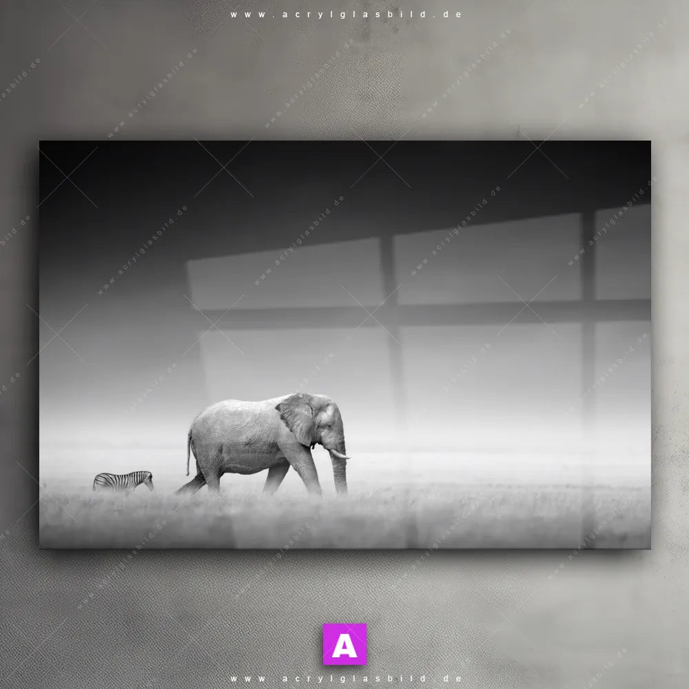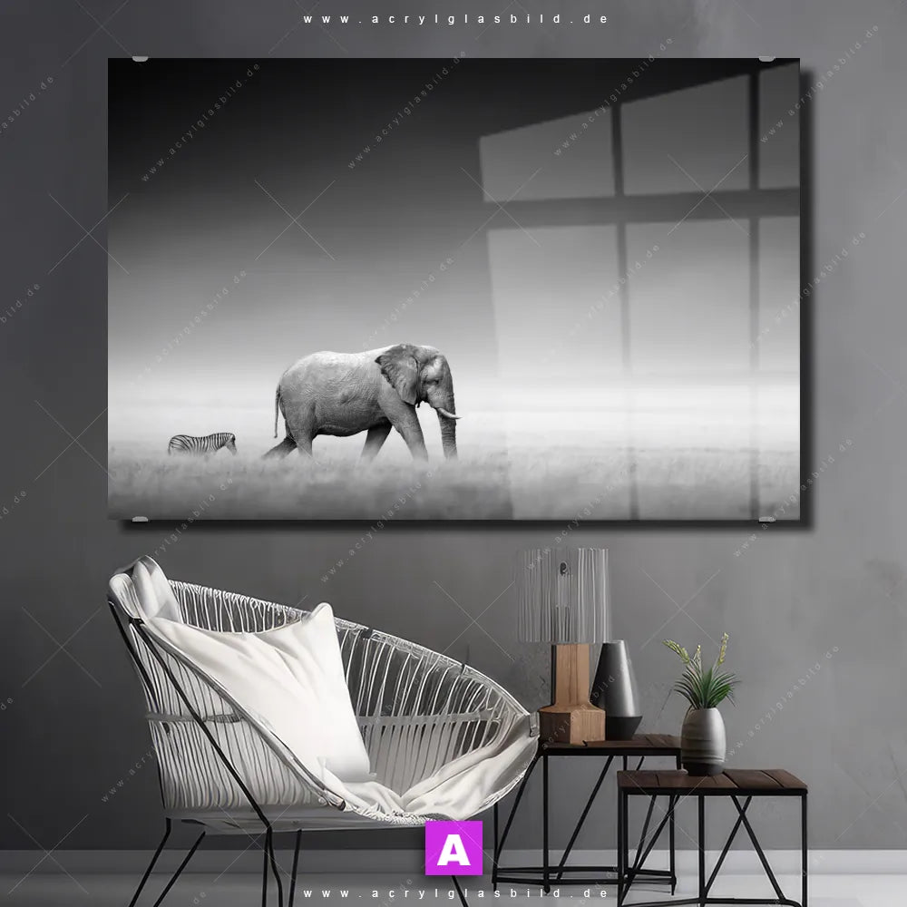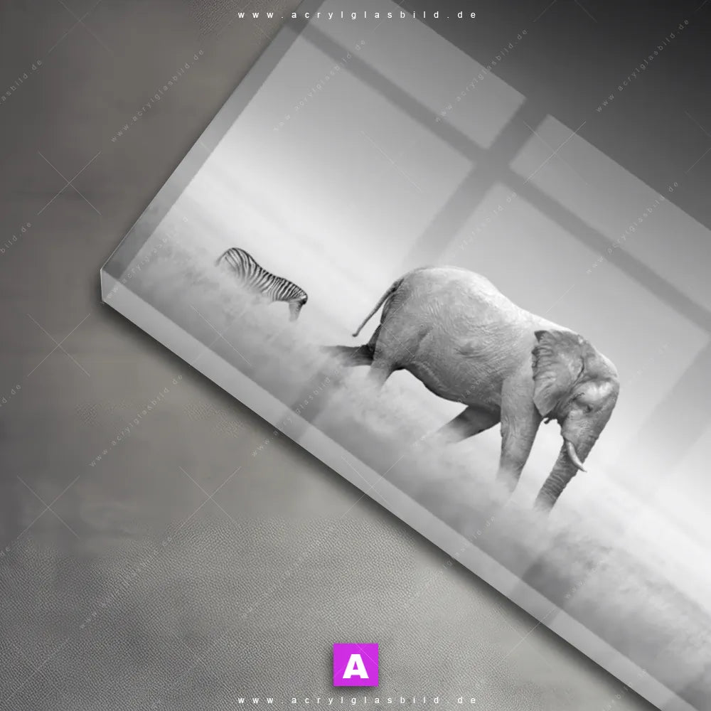 Das Motiv Freundschaft wird im UV-Direktdruck in den Farben Weiss, Schwarz auf die Rückseite einer 5mm starken, transparenten Acrylglasplatte gedruckt. Das durchscheinende Motiv Zebra und Elefant im Natürlich - Realistisch, Schwarz - Weiss Stil wird anschließend vollflächig mit einer weißen Schicht hinterlegt. Das Tierwelt, Landschaften Acrylglasbild | Querformat erhält so eine bemerkenswerte Farbbrillanz, hohe Schärfe und erstaunliche Tiefenwirkung.