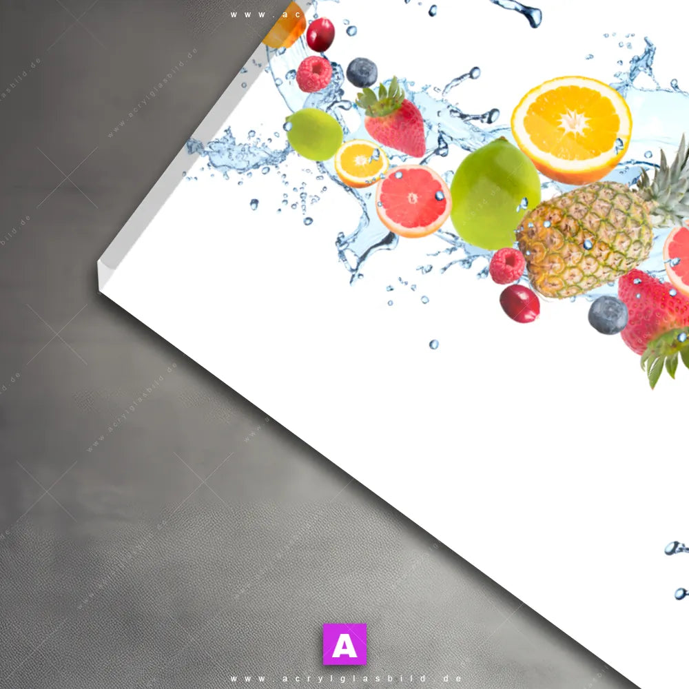 <b>Produktart:</b> Acrylglasbild | Glasbild | Wandbild aus Kunstglas | <b> Motiv:</b> Früchte in Spritzwasser | <b> Bildausrichtung:</b> Querformat | <b> Max. Motiv-Größe:</b> 421cm breit | 300cm hoch | <b> Verfügbare Formate: </b> Quadrat, Querformat, Hochformat, Panorama, Schmal, Rund | <b> Kategorie:</b> Essen - Trinken | <b> Farben:</b> Bunt, Weiss, Blau, Gelb , Braun, Grün, Lila, Orange, Rot | <b> Kunstformen:</b> Fotografie, Digitale Kunst | <b> Kunststile:</b> Mixed Media, Modern Art