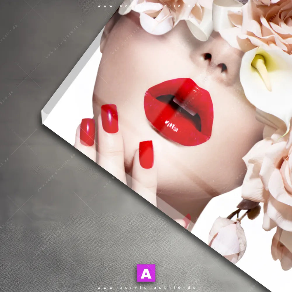 Unser Acrylglasbild verführerische Lippen aus der Kategorie Porträts - Menschen, Blumen - Botanik wird deinem Raum einen Hauch von Luxus verleihen, und du wirst nie wieder von Langeweile geplagt sein. Und wenn du nach einem Bild mit Menschen & Blumen, Frau, Porträt, modern, Beauty, Gesicht, Blumen, Blüten, Schönheit, Mode, Lippen suchst, empfehlen wir dir unser Acrylglasbild rote Lippen in den aufregenden Farben Beige, Weiss, Rot. Mit seiner Gestaltung als Fotografie passt es hervorragend zum Modern Art, Floral-Stil.