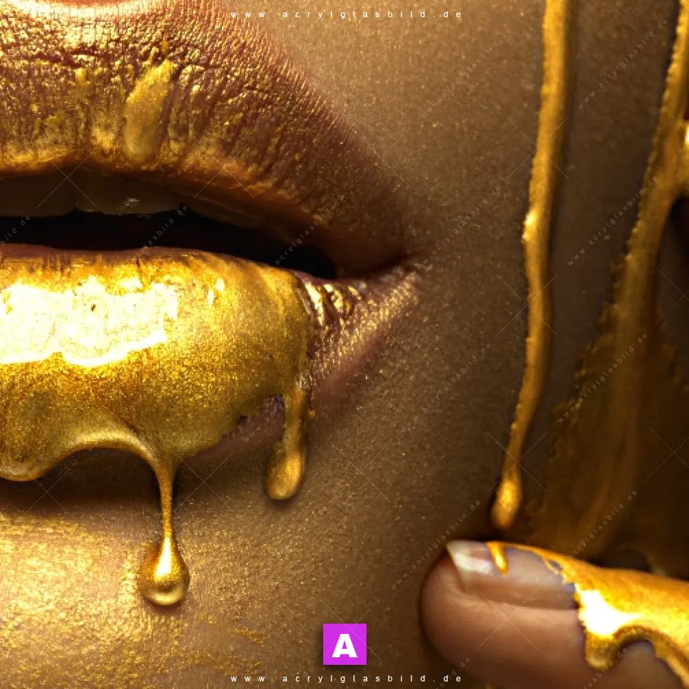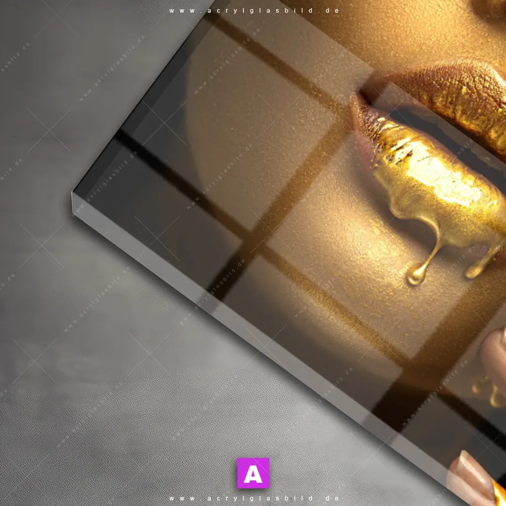<b>Produktart:</b> Acrylglasbild | Glasbild | Wandbild aus Kunstglas | <b> Motiv:</b> Goldene Lippen | <b> Bildausrichtung:</b> Querformat | <b> Max. Motiv-Größe:</b> 405cm breit | 204cm hoch | <b> Verfügbare Formate: </b> Quadrat, Querformat, Hochformat, Panorama, Schmal, Rund | <b> Kategorie:</b> Porträts - Menschen | <b> Farben:</b> Gold, Schwarz | <b> Kunstformen:</b> Fotografie | <b> Kunststile:</b> Modern Art, Natürlich - Realistisch