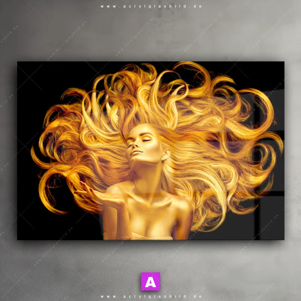 <b>Produktart:</b> Acrylglasbild | Glasbild | Wandbild aus Kunstglas | <b> Motiv:</b> Goldenes Haar No. 2 | <b> Bildausrichtung:</b> Querformat | <b> Max. Motiv-Größe:</b> 264cm breit | 180cm hoch | <b> Verfügbare Formate: </b> Quadrat, Querformat, Hochformat, Panorama, Schmal, Rund | <b> Kategorie:</b> Porträts - Menschen | <b> Farben:</b> Gold, Schwarz | <b> Kunstformen:</b> Fotografie | <b> Kunststile:</b> Natürlich - Realistisch, Modern Art