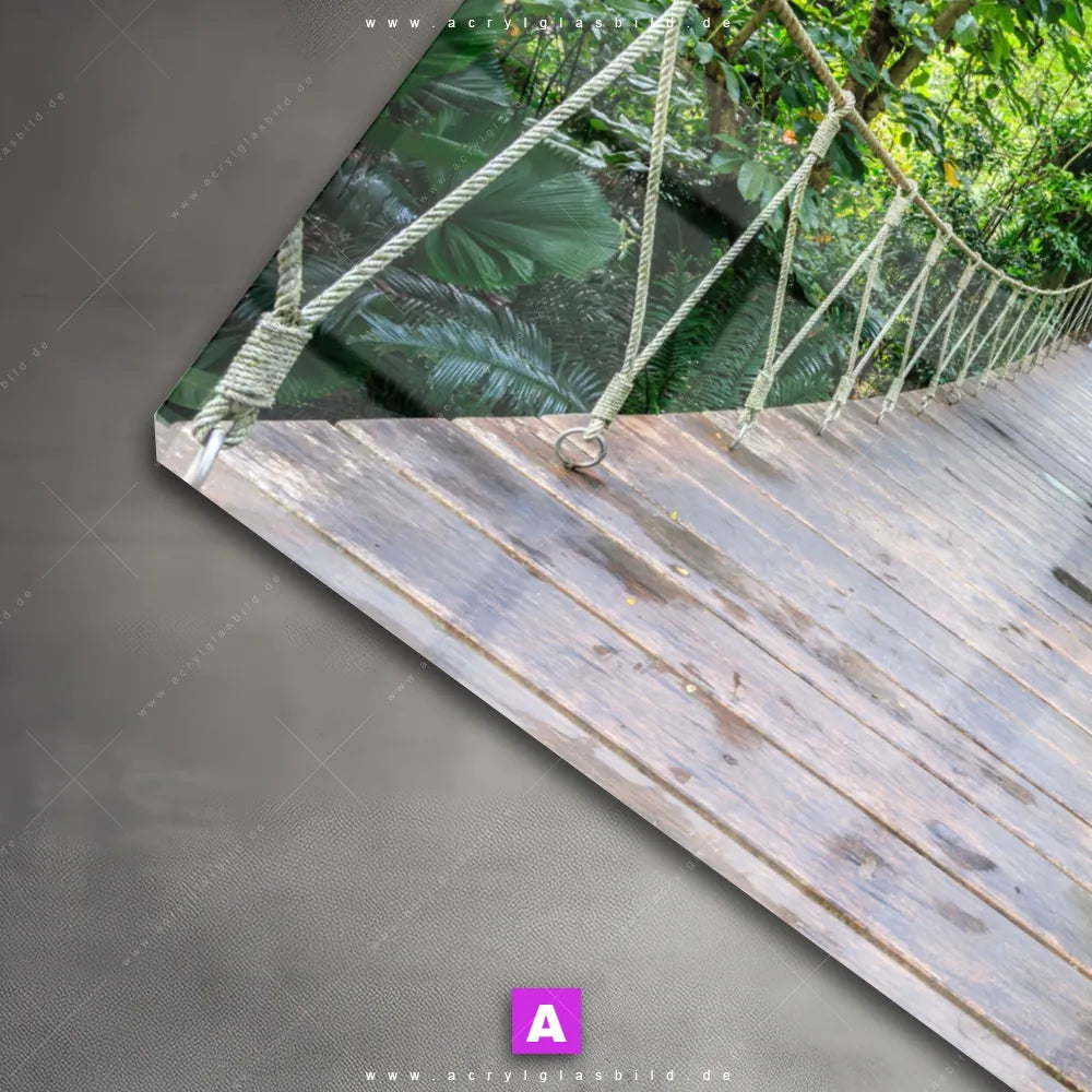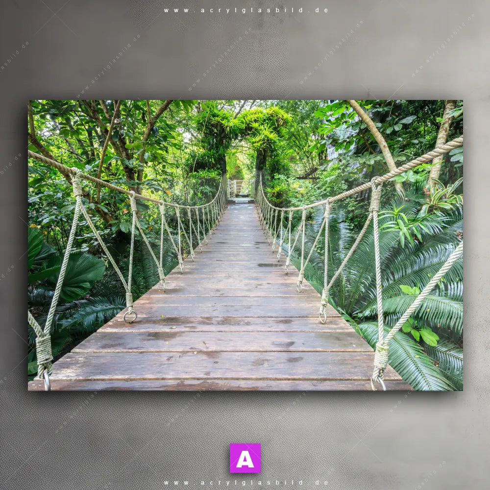 Hallo, du Meister der Dekoration oder Königin des Stils, bist du bereit, deine Räume, wie Arzt - Praxis, Büro - Kanzlei, Wohnzimmer - Schlafzimmer, in einen kreativen Kunstsalon zu verwandeln? Dann haben wir das perfekte Wandkunstwerk für dich: Unser Acrylglasbild Hängebrücke im Dschungel im Querformat wird im Handumdrehen jeden Raum auf ein neues Level heben!