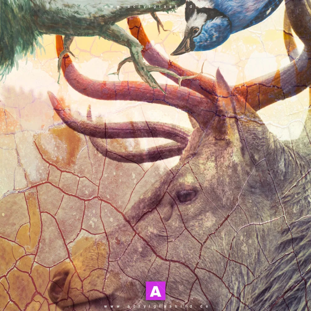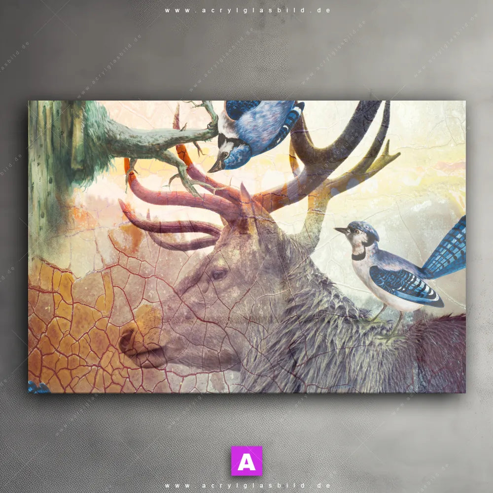 <b>Produktart:</b> Acrylglasbild | Glasbild | Wandbild aus Kunstglas | <b> Motiv:</b> Hirsch & Vögel | <b> Bildausrichtung:</b> Querformat | <b> Max. Motiv-Größe:</b> 210cm breit | 280cm hoch | <b> Verfügbare Formate: </b> Quadrat, Querformat, Hochformat, Panorama, Schmal, Rund | <b> Kategorie:</b> Tierwelt | <b> Farben:</b> Beige, Braun, Blau | <b> Kunstformen:</b> Digitale Kunst | <b> Kunststile:</b> Abstrakt, Modern Art, Grunge, Mixed Media