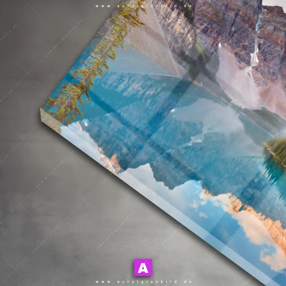 Das Motiv Kanadischer Bergsee wird im UV-Direktdruck in den Farben Blau, Grün auf die Rückseite einer 5mm starken, transparenten Acrylglasplatte gedruckt. Das durchscheinende Motiv Bergsee in nördlichen Ländern im Natürlich - Realistisch Stil wird anschließend vollflächig mit einer weißen Schicht hinterlegt. Das Landschaften Acrylglasbild | Querformat erhält so eine bemerkenswerte Farbbrillanz, hohe Schärfe und erstaunliche Tiefenwirkung.
