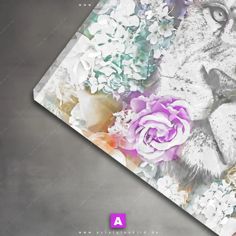 <b>Produktart:</b> Acrylglasbild | Glasbild | Wandbild aus Kunstglas | <b> Motiv:</b> Löwe & Blumen | <b> Bildausrichtung:</b> Querformat | <b> Max. Motiv-Größe:</b> 240cm breit | 350cm hoch | <b> Verfügbare Formate: </b> Quadrat, Querformat, Hochformat, Panorama, Schmal, Rund | <b> Kategorie:</b> Tierwelt, Blumen - Botanik | <b> Farben:</b> Rosa, Pink, Weiss, Grau , Grün, Gold, Orange, Braun, Beige | <b> Kunstformen:</b> Kunst - Malerei | <b> Kunststile:</b> Floral, Modern Art