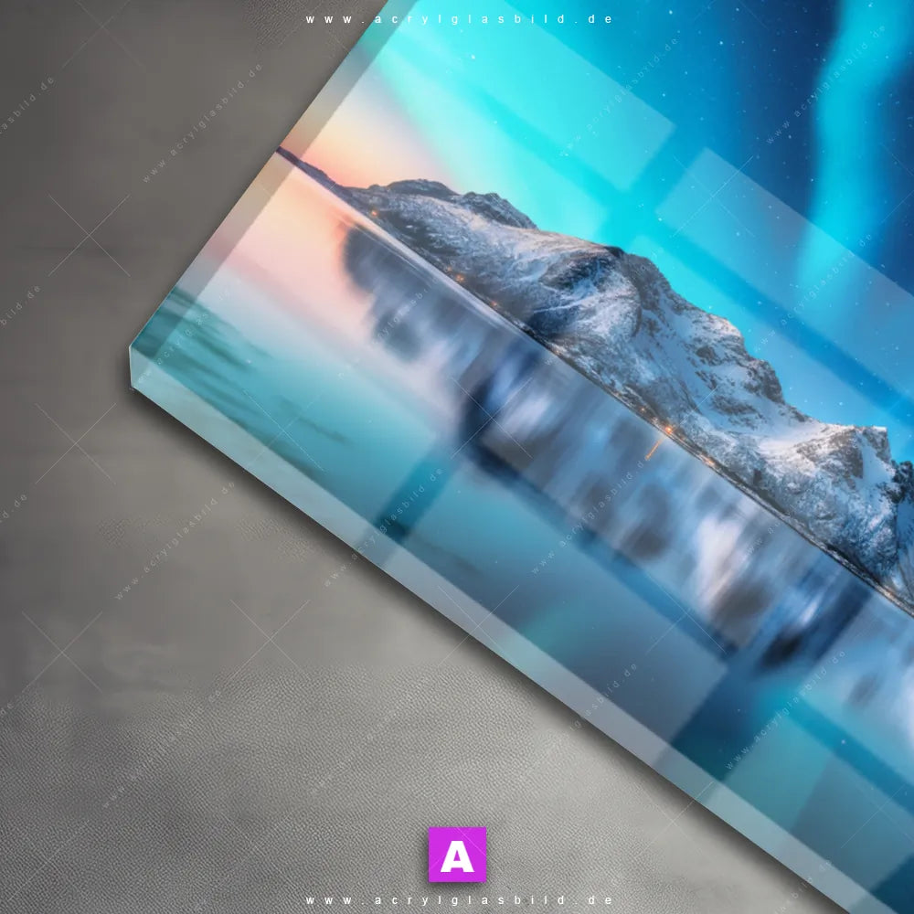 Das Motiv Nordlichter und schneebedeckte Berge wird im UV-Direktdruck in den Farben Blau, Türkis, Weiss auf die Rückseite einer 5mm starken, transparenten Acrylglasplatte gedruckt. Das durchscheinende Motiv Polarlichter über skandinavischer Landschaft im Natürlich - Realistisch Stil wird anschließend vollflächig mit einer weißen Schicht hinterlegt. Das Landschaften Acrylglasbild | Querformat erhält so eine bemerkenswerte Farbbrillanz, hohe Schärfe und erstaunliche Tiefenwirkung.