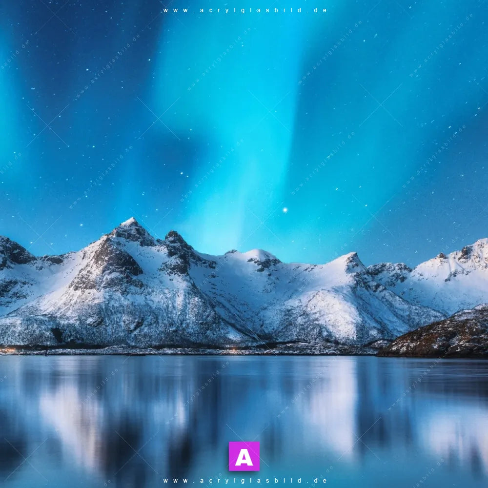 <b>Produktart:</b> Acrylglasbild | Glasbild | Wandbild aus Kunstglas | <b> Motiv:</b> Nordlichter und schneebedeckte Berge | <b> Bildausrichtung:</b> Querformat | <b> Max. Motiv-Größe:</b> 350cm breit | 260cm hoch | <b> Verfügbare Formate: </b> Quadrat, Querformat, Hochformat, Panorama, Schmal, Rund | <b> Kategorie:</b>  Landschaften | <b> Farben:</b>  Blau, Türkis, Weiss | <b> Kunstformen:</b>  Fotografie | <b> Kunststile:</b>  Natürlich - Realistisch