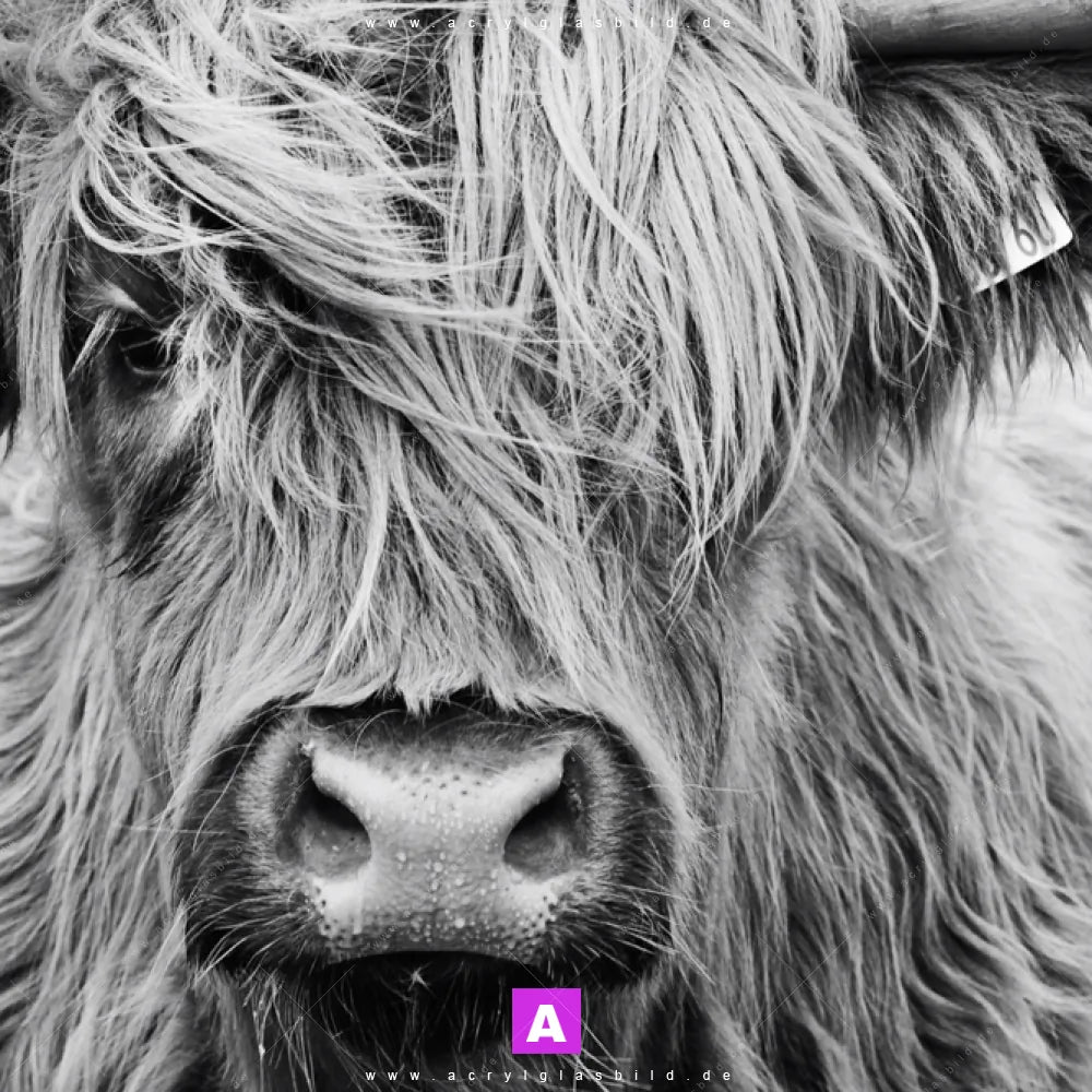 Das Motiv Rind im Hochland wird im UV-Direktdruck in den Farben Schwarz, Weiss auf die Rückseite einer 5mm starken, transparenten Acrylglasplatte gedruckt. Das durchscheinende Motiv Hochlandrind Grautöne im Natürlich - Realistisch, Schwarz - Weiss Stil wird anschließend vollflächig mit einer weißen Schicht hinterlegt. Das Tierwelt Acrylglasbild | Querformat erhält so eine bemerkenswerte Farbbrillanz, hohe Schärfe und erstaunliche Tiefenwirkung.