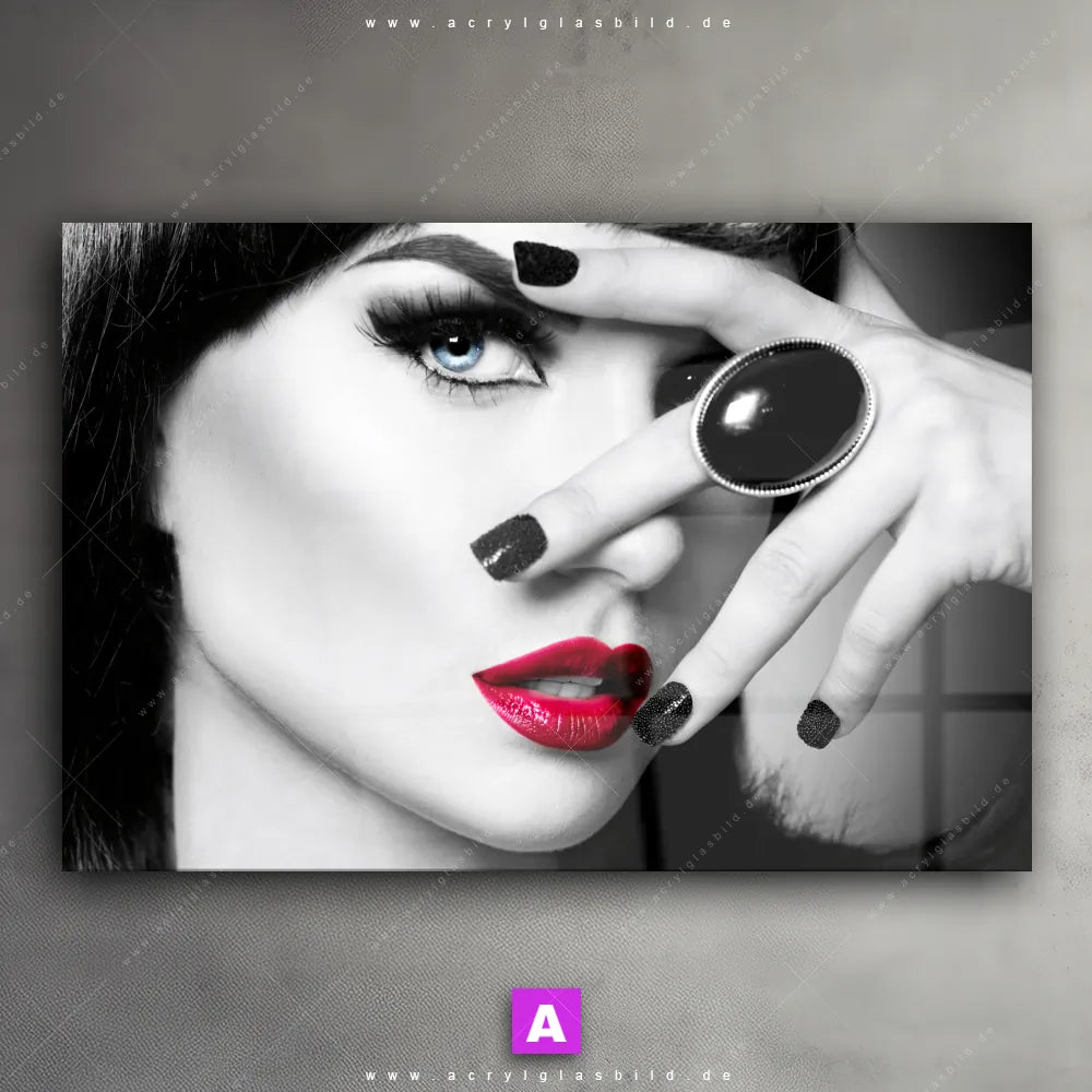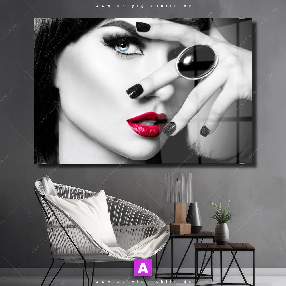 <b>Produktart:</b> Acrylglasbild | Glasbild | Wandbild aus Kunstglas | <b> Motiv:</b> Schöne Geheimnisvolle | <b> Bildausrichtung:</b> Querformat | <b> Max. Motiv-Größe:</b> 300cm breit | 360cm hoch | <b> Verfügbare Formate: </b> Quadrat, Querformat, Hochformat, Panorama, Schmal, Rund | <b> Kategorie:</b> Porträts - Menschen | <b> Farben:</b> Schwarz, Weiss, Rot | <b> Kunstformen:</b> Fotografie | <b> Kunststile:</b> Modern Art, Schwarz - Weiss