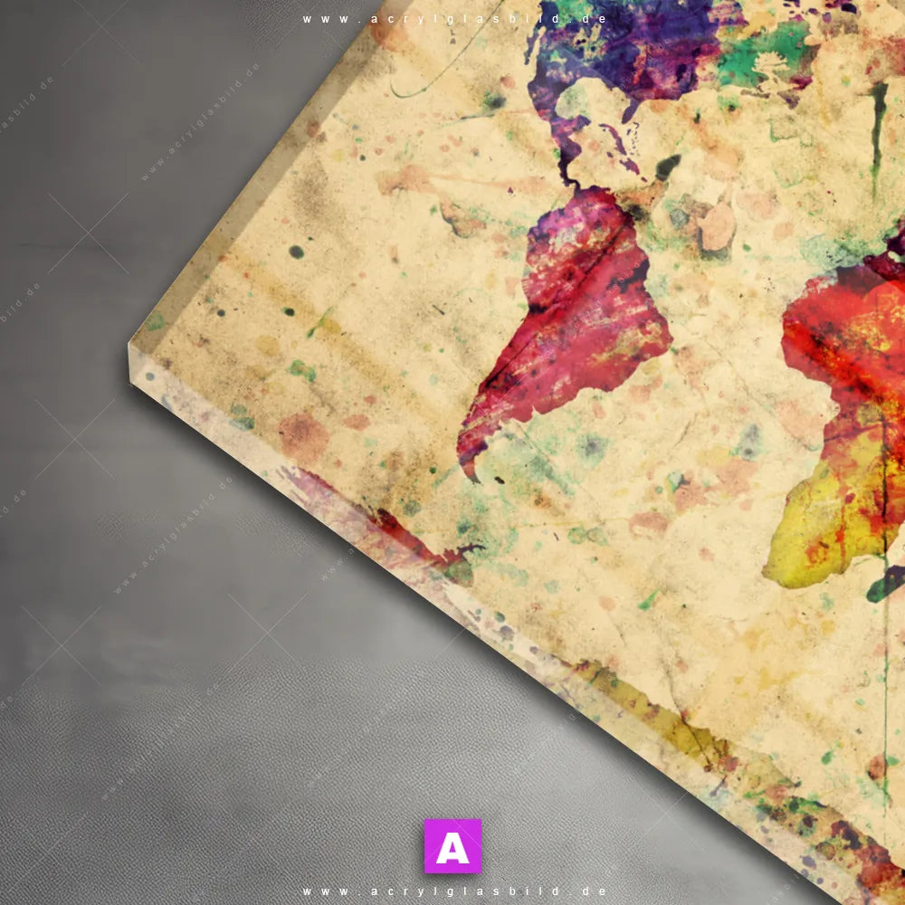 Das Motiv Weltkarte Retro Bunt wird im UV-Direktdruck in den Farben Bunt, Beige auf die Rückseite einer 5mm starken, transparenten Acrylglasplatte gedruckt. Das durchscheinende Motiv bunte Kontinente im Abstrakt, Grunge, Retro - Vintage, Modern Art Stil wird anschließend vollflächig mit einer weißen Schicht hinterlegt. Das Karten Acrylglasbild | Querformat erhält so eine bemerkenswerte Farbbrillanz, hohe Schärfe und erstaunliche Tiefenwirkung.