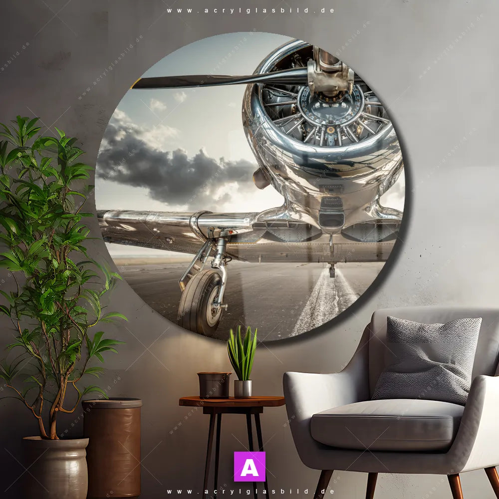 <b>Produktart:</b> Acrylglasbild | Glasbild | Wandbild aus Kunstglas | <b> Motiv:</b> Bereit zum Abheben | <b> Bildausrichtung:</b> Rund | <b> Max. Motiv-Größe:</b> 450cm breit | 300cm hoch | <b> Verfügbare Formate: </b> Quadrat, Querformat, Hochformat, Panorama, Schmal, Rund | <b> Kategorie:</b>  Fahrzeuge | <b> Farben:</b>  Beige, Silber, Gold | <b> Kunstformen:</b>  Fotografie | <b> Kunststile:</b>  Natürlich - Realistisch, Retro - Vintage, Schwarz - Weiss