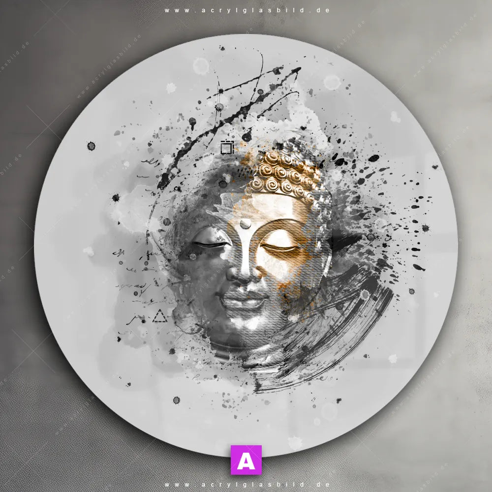 <b>Produktart:</b> Acrylglasbild | Glasbild | Wandbild aus Kunstglas | <b> Motiv:</b> Buddha - Grunge-Stil | <b> Bildausrichtung:</b> Rund | <b> Max. Motiv-Größe:</b> 240cm breit | 240cm hoch | <b> Verfügbare Formate: </b> Quadrat, Querformat, Hochformat, Panorama, Schmal, Rund | <b> Kategorie:</b> Buddha - Feng Shui | <b> Farben:</b> Silber, Gold | <b> Kunstformen:</b> Digitale Kunst | <b> Kunststile:</b> Abstrakt, Grunge, Mixed Media, Modern Art