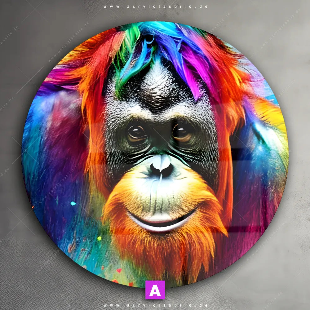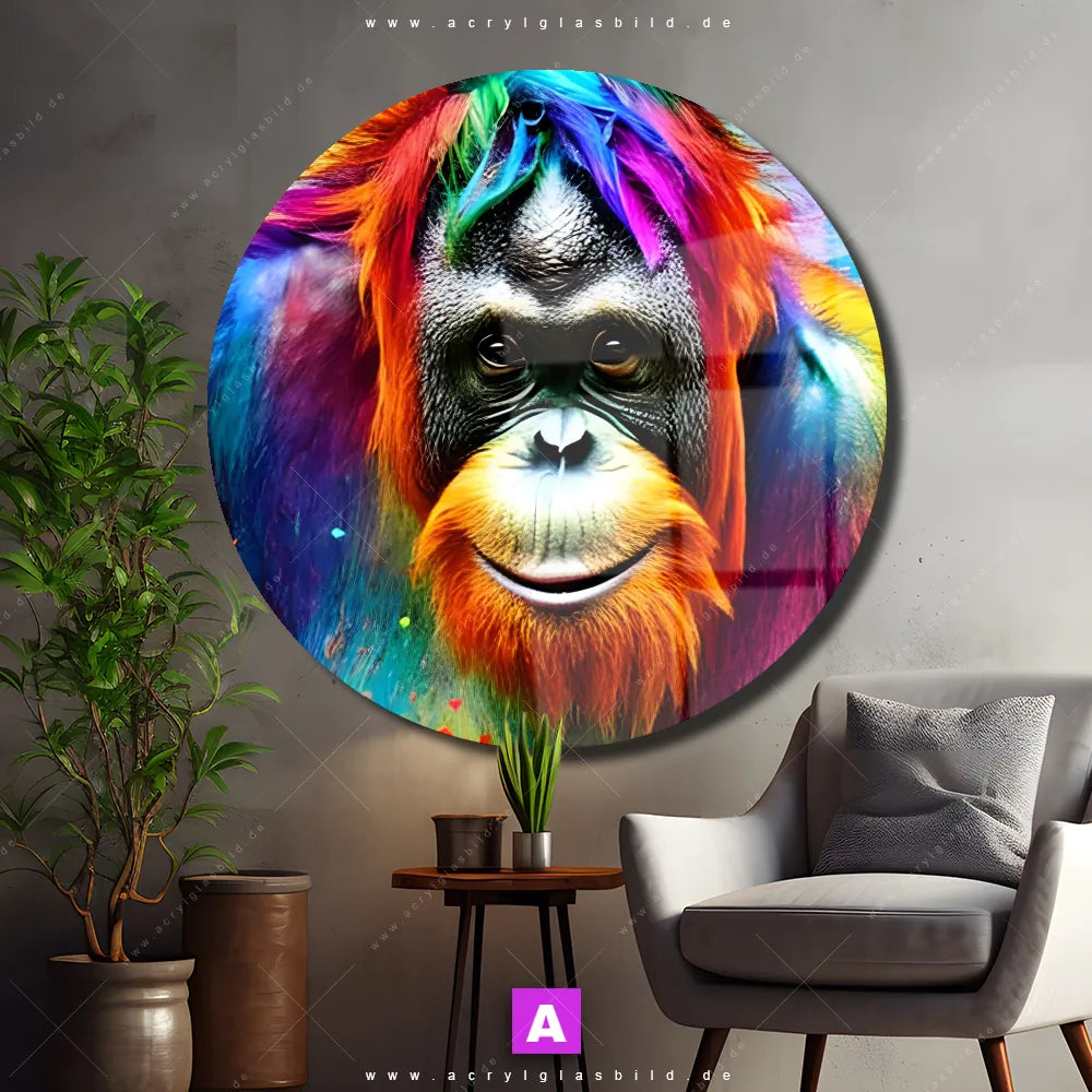 <b>Produktart:</b> Acrylglasbild | Glasbild | Wandbild aus Kunstglas | <b> Motiv:</b> Bunter Orang-Utan | <b> Bildausrichtung:</b> Rund | <b> Max. Motiv-Größe:</b> 270cm breit | 180cm hoch | <b> Verfügbare Formate: </b> Quadrat, Querformat, Hochformat, Panorama, Schmal, Rund | <b> Kategorie:</b> Tierwelt | <b> Farben:</b> Bunt | <b> Kunstformen:</b> Digitale Kunst | <b> Kunststile:</b> Abstrakt, Modern Art, Pop Art