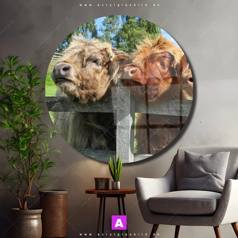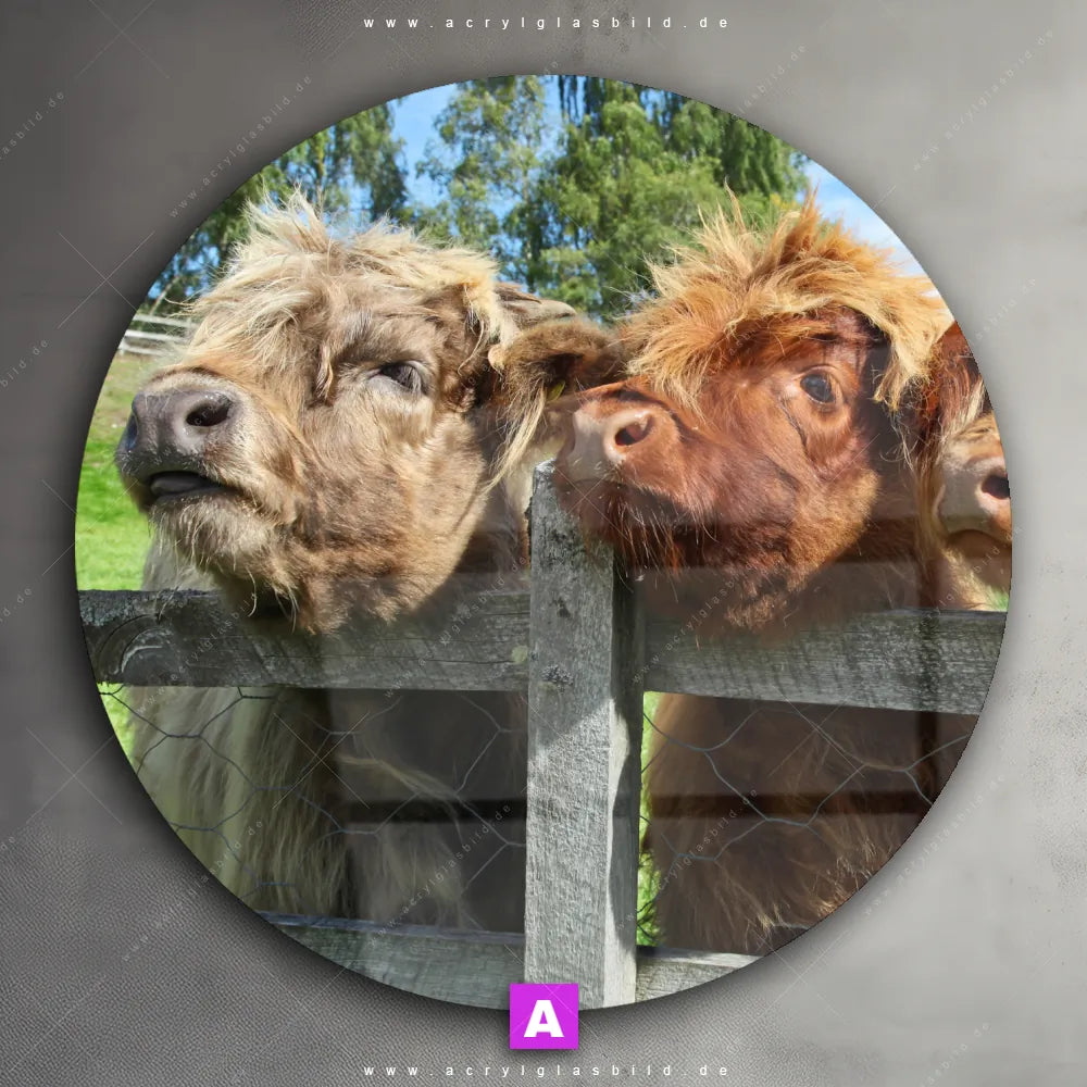 Hey du! Bist du es auch leid, auf langweilige, weiße Wände in deinem Raum zu starren und dich zu fragen, ob das der Sinn des Lebens ist? Unser Acrylglasbild mit dem Titel Drei Schottische Rinder im Format Rund verwandelt deine Wand in ein Kunstwerk und macht deinen Raum zum absoluten Hingucker.