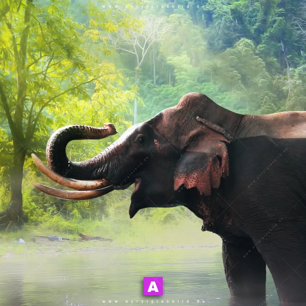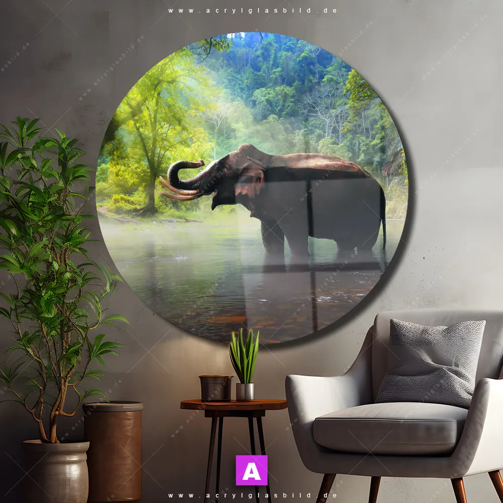 <b>Produktart:</b> Acrylglasbild | Glasbild | Wandbild aus Kunstglas | <b> Motiv:</b> Elefant im Wasser | <b> Bildausrichtung:</b> Rund | <b> Max. Motiv-Größe:</b> 270cm breit | 180cm hoch | <b> Verfügbare Formate: </b> Quadrat, Querformat, Hochformat, Panorama, Schmal, Rund | <b> Kategorie:</b> Tierwelt | <b> Farben:</b> Grün, Braun | <b> Kunstformen:</b> Digitale Kunst | <b> Kunststile:</b> Natürlich - Realistisch