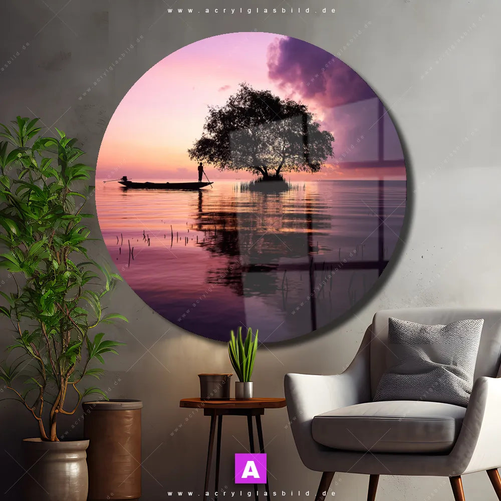 Das Motiv Fischer auf Boot Sonnenaufgang wird im UV-Direktdruck in den Farben Lila, Rosa, Schwarz auf die Rückseite einer 5mm starken, transparenten Acrylglasplatte gedruckt. Das durchscheinende Motiv Ein Morgen auf dem See im Natürlich - Realistisch Stil wird anschließend vollflächig mit einer weißen Schicht hinterlegt. Das Landschaften Acrylglasbild | Rund erhält so eine bemerkenswerte Farbbrillanz, hohe Schärfe und erstaunliche Tiefenwirkung.