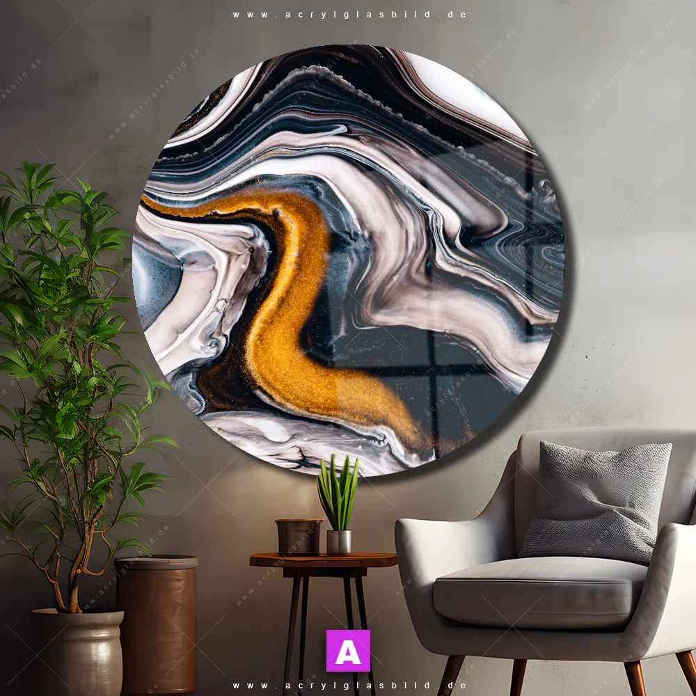 Hey du! Bist du es auch leid, auf langweilige, weiße Wände in deinem Raum zu starren und dich zu fragen, ob das der Sinn des Lebens ist? Unser Acrylglasbild mit dem Titel Fluid Art Goldrausch im Format Rund verwandelt deine Wand in ein Kunstwerk und macht deinen Raum zum absoluten Hingucker.