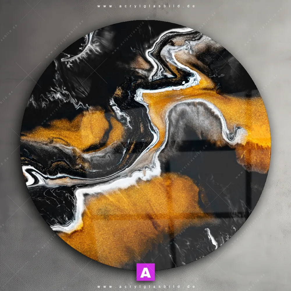 <b>Produktart:</b> Acrylglasbild | Glasbild | Wandbild aus Kunstglas | <b> Motiv:</b> Fluid Art Schwarzes Meer | <b> Bildausrichtung:</b> Rund | <b> Max. Motiv-Größe:</b> 360cm breit | 240cm hoch | <b> Verfügbare Formate: </b> Quadrat, Querformat, Hochformat, Panorama, Schmal, Rund | <b> Kategorie:</b> Muster - Texturen | <b> Farben:</b> Schwarz, Orange, Gold | <b> Kunstformen:</b> Fotografie, Kunst - Malerei | <b> Kunststile:</b> Abstrakt, Modern Art
