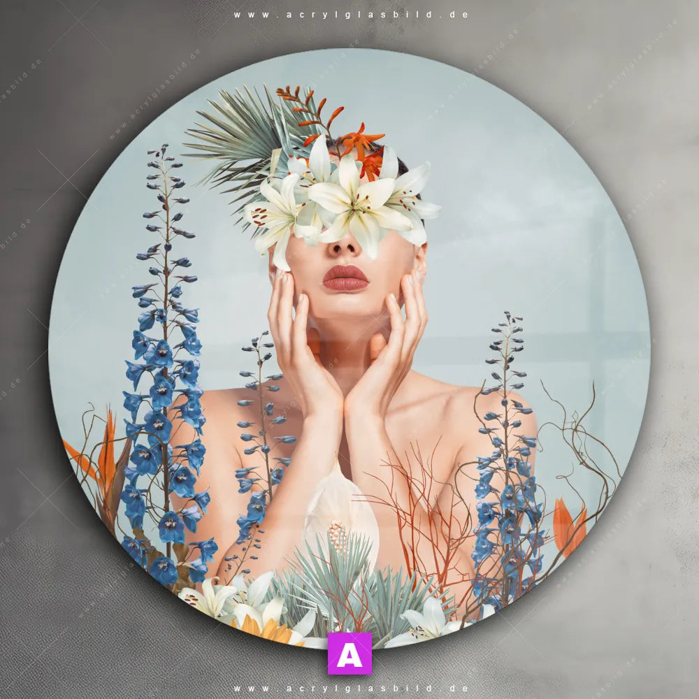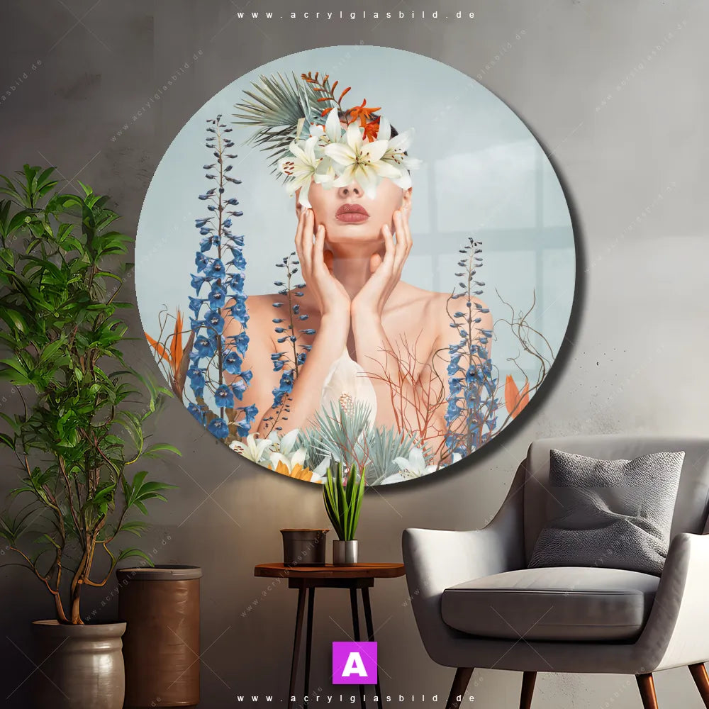 <b>Produktart:</b> Acrylglasbild | Glasbild | Wandbild aus Kunstglas | <b> Motiv:</b> Frauenportrait mit Blumen | <b> Bildausrichtung:</b> Rund | <b> Max. Motiv-Größe:</b> 400cm breit | 315cm hoch | <b> Verfügbare Formate: </b> Quadrat, Querformat, Hochformat, Panorama, Schmal, Rund | <b> Kategorie:</b> Porträts - Menschen, Blumen - Botanik | <b> Farben:</b> Mint, Beige, Weiss, Blau, Orange | <b> Kunstformen:</b> Fotografie | <b> Kunststile:</b> Modern Art, Floral