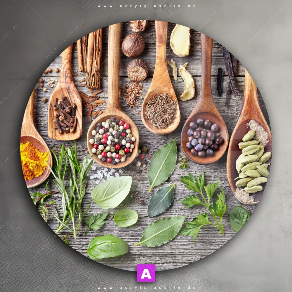 Hey du! Bist du es auch leid, auf langweilige, weiße Wände in deinem Raum zu starren und dich zu fragen, ob das der Sinn des Lebens ist? Unser Acrylglasbild mit dem Titel Gewürze auf Holzlöffeln im Format Rund verwandelt deine Wand in ein Kunstwerk und macht deinen Raum zum absoluten Hingucker.