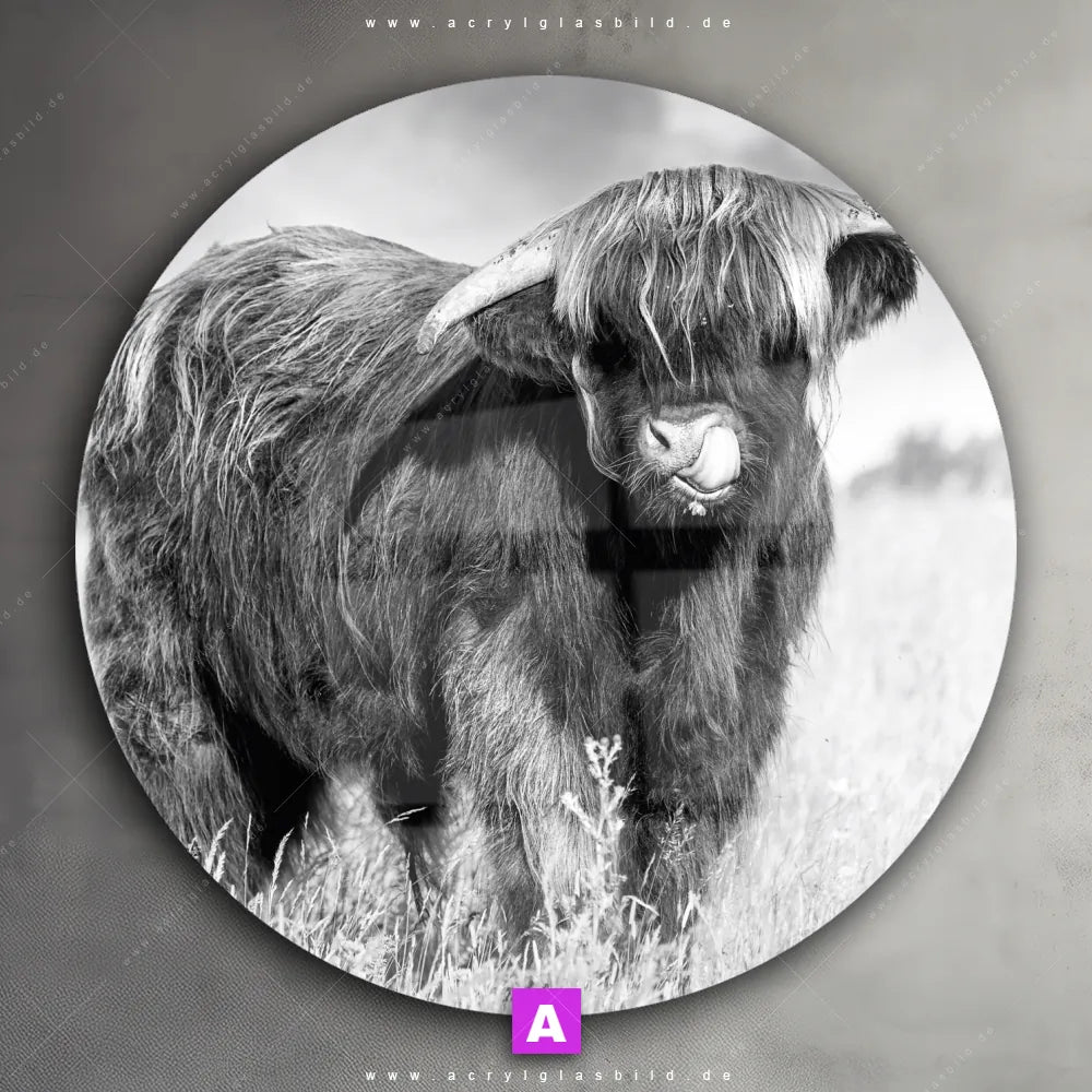 <b>Produktart:</b> Acrylglasbild | Glasbild | Wandbild aus Kunstglas | <b> Motiv:</b> Hochlandkuh auf einer Wiese | <b> Bildausrichtung:</b> Rund | <b> Max. Motiv-Größe:</b> 450cm breit | 300cm hoch | <b> Verfügbare Formate: </b> Quadrat, Querformat, Hochformat, Panorama, Schmal, Rund | <b> Kategorie:</b> Tierwelt | <b> Farben:</b> Schwarz, Weiss | <b> Kunstformen:</b> Fotografie | <b> Kunststile:</b> Natürlich - Realistisch, Modern Art, Schwarz - Weiss