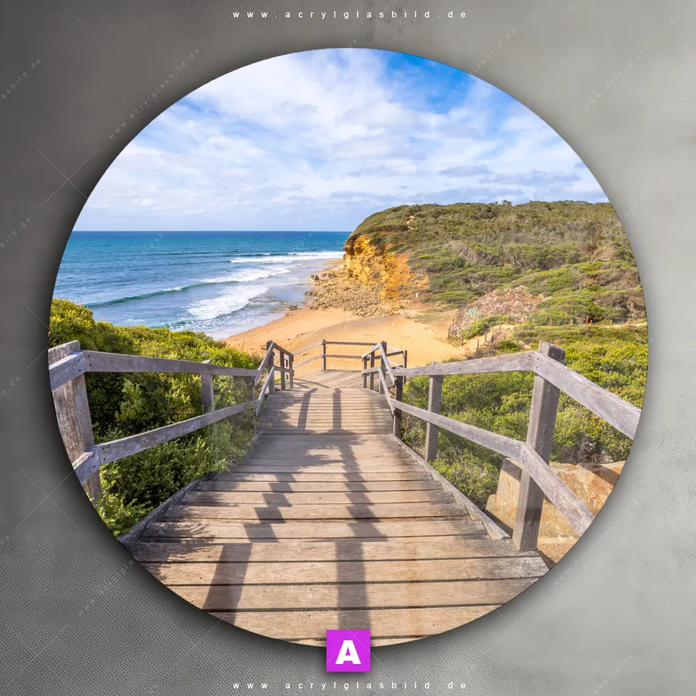Hey du! Bist du es auch leid, auf langweilige, weiße Wände in deinem Raum zu starren und dich zu fragen, ob das der Sinn des Lebens ist? Unser Acrylglasbild mit dem Titel Holztreppe zum einsamen Strand im Format Rund verwandelt deine Wand in ein Kunstwerk und macht deinen Raum zum absoluten Hingucker.