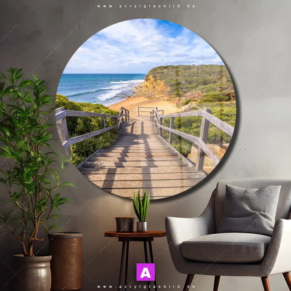 Acrylglasbild | Holztreppe zum einsamen Strand | Rund