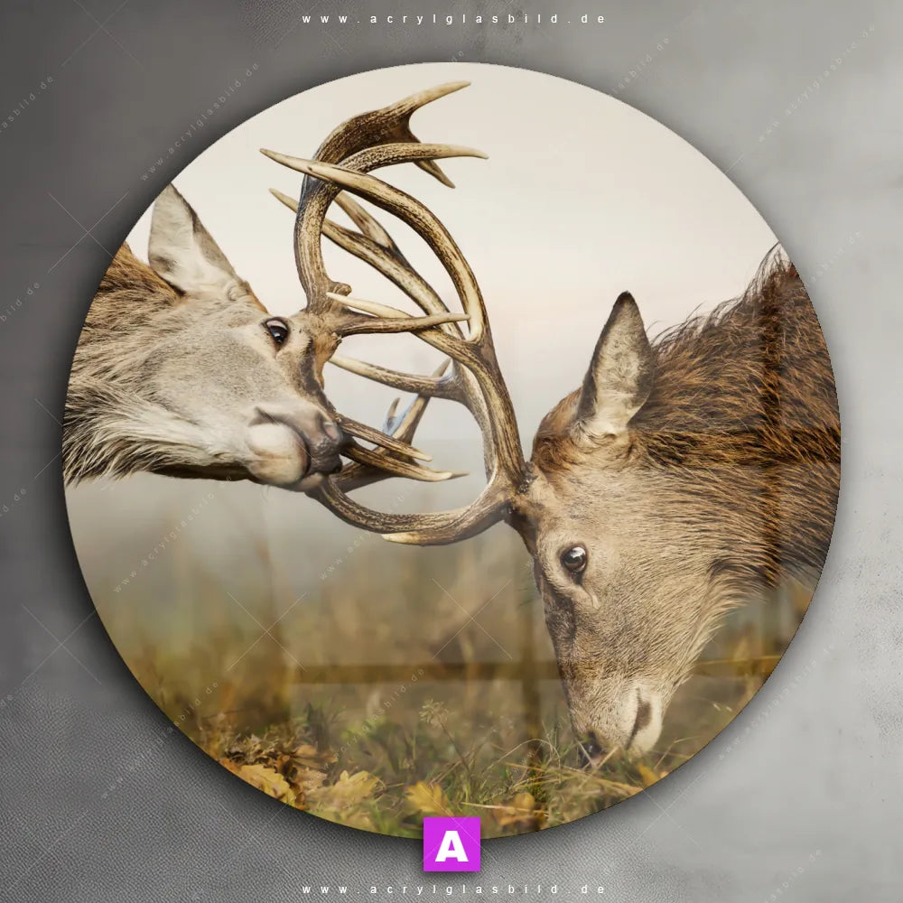 Hey du! Bist du es auch leid, auf langweilige, weiße Wände in deinem Raum zu starren und dich zu fragen, ob das der Sinn des Lebens ist? Unser Acrylglasbild mit dem Titel Kämpfende Hirsche im Format Rund verwandelt deine Wand in ein Kunstwerk und macht deinen Raum zum absoluten Hingucker.