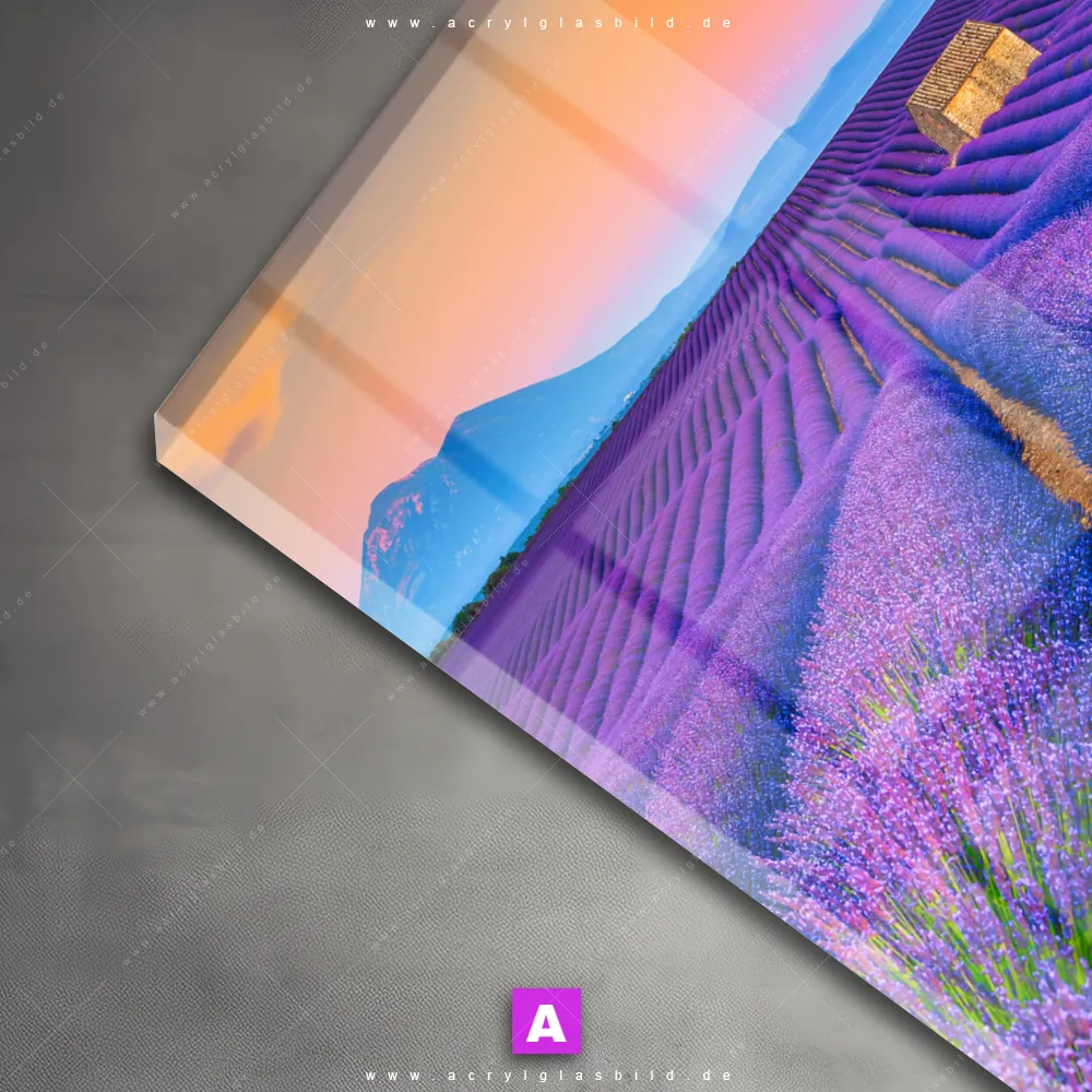 Das Motiv Lavendel Blumen Feld wird im UV-Direktdruck in den Farben Lila, Orange auf die Rückseite einer 5mm starken, transparenten Acrylglasplatte gedruckt. Das durchscheinende Motiv Häuschen im Lavendelfeld im Floral, Natürlich - Realistisch Stil wird anschließend vollflächig mit einer weißen Schicht hinterlegt. Das Landschaften Acrylglasbild | Rund erhält so eine bemerkenswerte Farbbrillanz, hohe Schärfe und erstaunliche Tiefenwirkung.