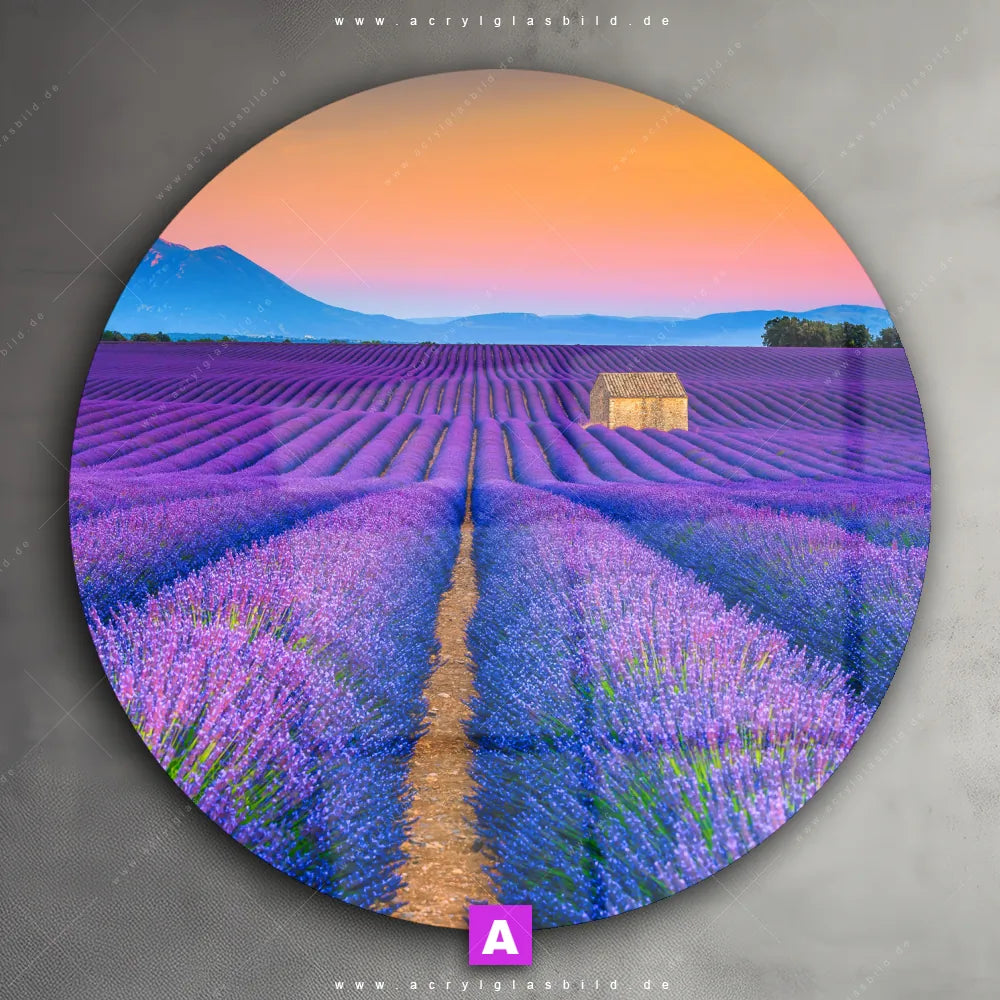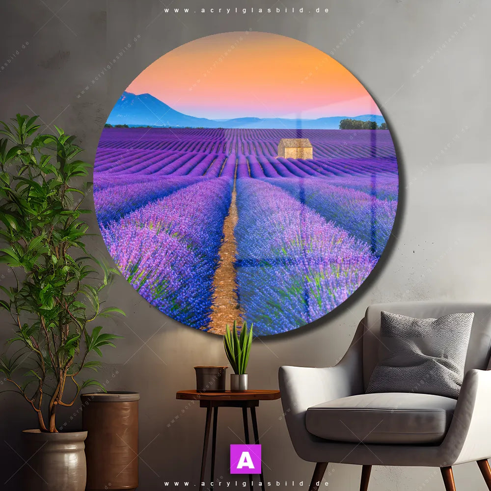 <b>Produktart:</b> Acrylglasbild | Glasbild | Wandbild aus Kunstglas | <b> Motiv:</b> Lavendel Blumen Feld | <b> Bildausrichtung:</b> Rund | <b> Max. Motiv-Größe:</b> 450cm breit | 300cm hoch | <b> Verfügbare Formate: </b> Quadrat, Querformat, Hochformat, Panorama, Schmal, Rund | <b> Kategorie:</b> Landschaften | <b> Farben:</b> Lila, Orange | <b> Kunstformen:</b> Fotografie | <b> Kunststile:</b> Floral, Natürlich - Realistisch