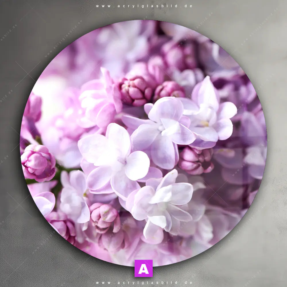 <b>Produktart:</b> Acrylglasbild | Glasbild | Wandbild aus Kunstglas | <b> Motiv:</b> Lila Fliederblüten | <b> Bildausrichtung:</b> Rund | <b> Max. Motiv-Größe:</b> 360cm breit | 240cm hoch | <b> Verfügbare Formate: </b> Quadrat, Querformat, Hochformat, Panorama, Schmal, Rund | <b> Kategorie:</b> Blumen - Botanik | <b> Farben:</b> Weiss, Rosa, Lila | <b> Kunstformen:</b> Fotografie | <b> Kunststile:</b> Floral, Modern Art