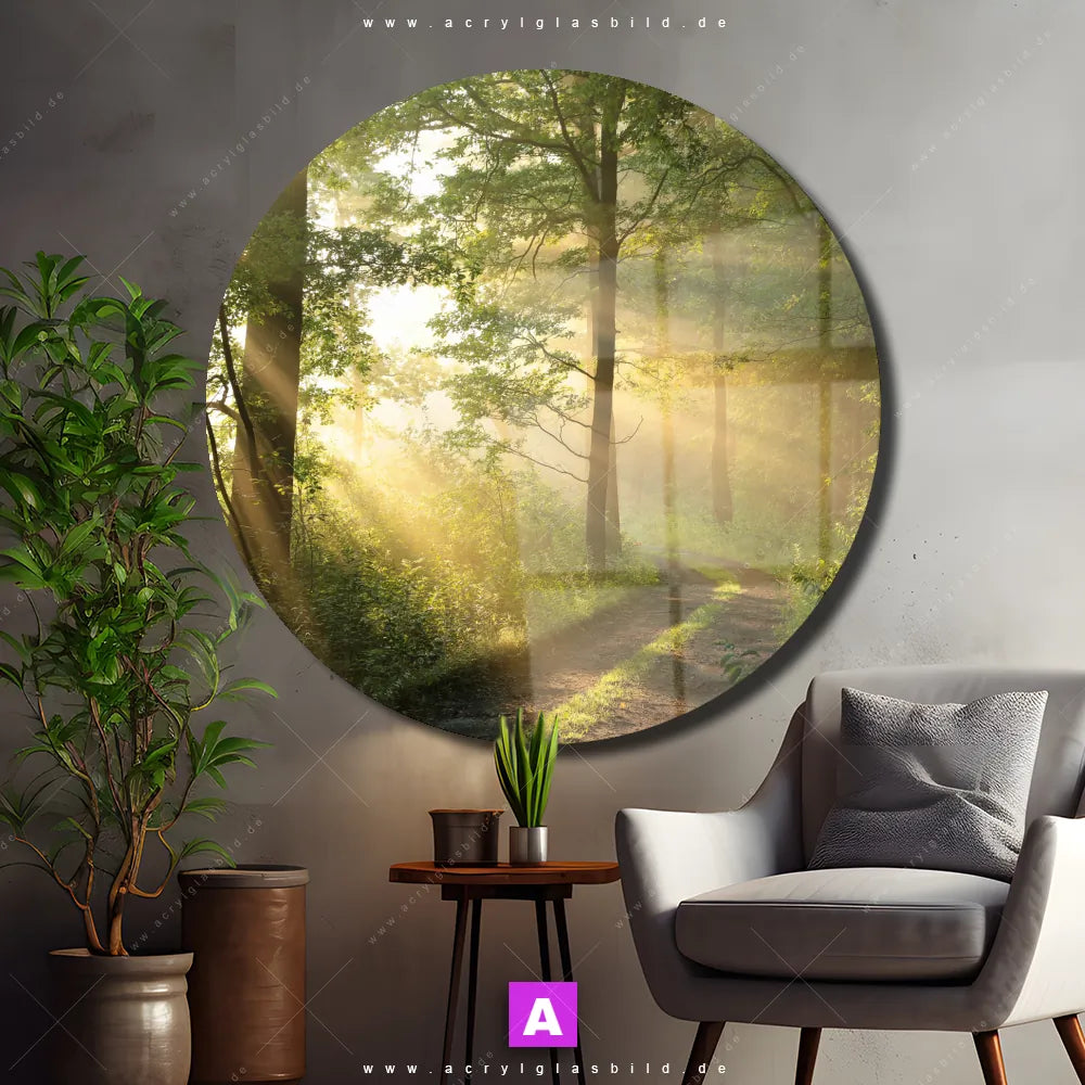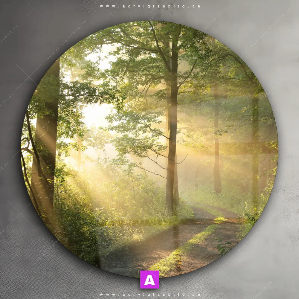 Acrylglasbild | Morgenspaziergang im nebeligem Wald | Rund